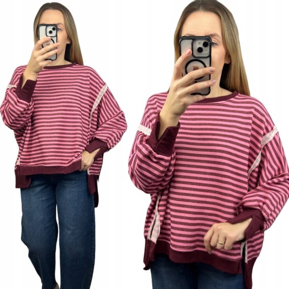 Bluza oversize luźna w poziome paski bawełniana rozcięcia bordo róż Azara- CUT