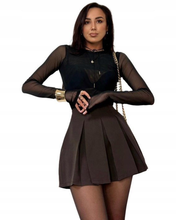 Stylowe spódnico-spodenki plisowane, które łączą wygodę spodenek z elegancją spódnicy. Model o lekko rozkloszowanym kroju, wykonany z przyjemnej w dotyku tkaniny w odcieniu czekoladowego brązu.