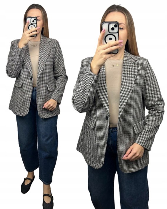 Stylowa marynarka Azara w klasyczny wzór pepitki to ponadczasowy element garderoby, który doda charakteru każdej stylizacji. Model z patkami imitującymi kieszenie oraz poduszkami na ramionach pięknie podkreśla sylwetkę i ramiona, nadając im strukturę. Zapinana na jeden guzik, z pełną podszewką, zapewnia wygodę i komfort noszenia.