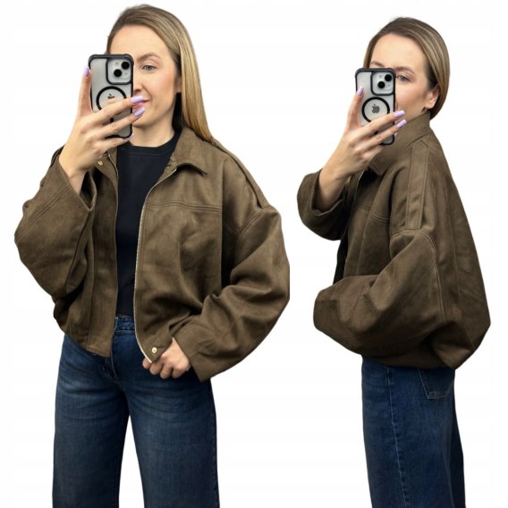 Modna kurtka bomberka w stylu oversize, wykonana z wysokiej jakości ekologicznego zamszu w kolorze brązowym z oliwkowymi podtonami.