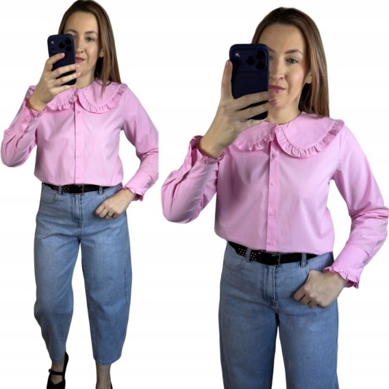 Różowa koszula bawełniana z kołnierzem falbanką S