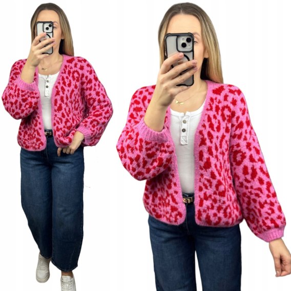 Różowy czerwony sweter kardigan panterka pantera cętki szersze rękawy- LEO CARDI