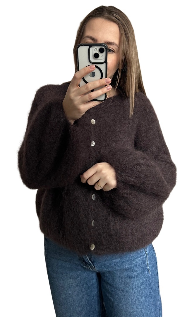 Sweter czekolada puszysty kid moher prążek szerokie rękawy dzwonki moherowy- SOFT BELL CARDI