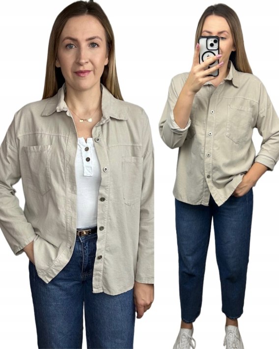 Sztruksowa bawełniana koszula z kieszeniami luźna beżowa- CORDUROY