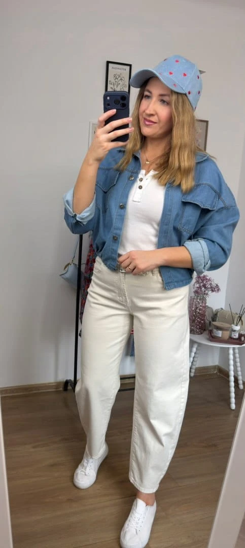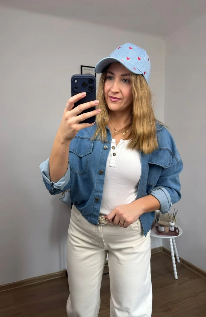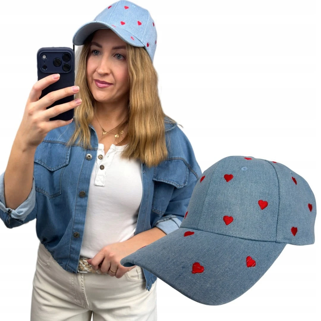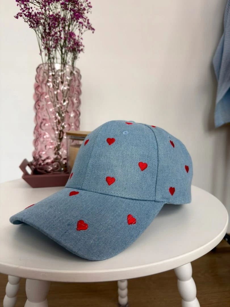 Stylowa czapka z daszkiem w subtelnym, niebieskim odcieniu jeansu, ozdobiona uroczym haftem w drobne serca. To model, który idealnie łączy klasykę z dziewczęcym, lekkim akcentem.