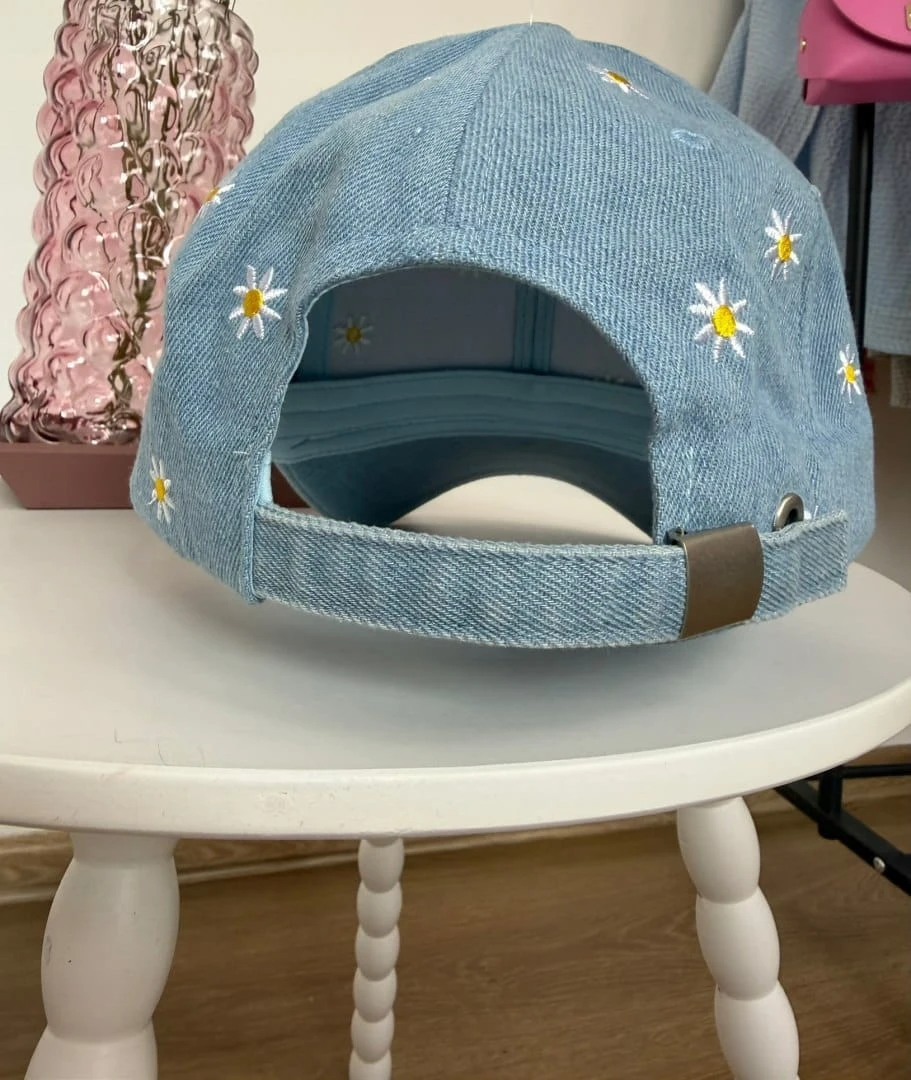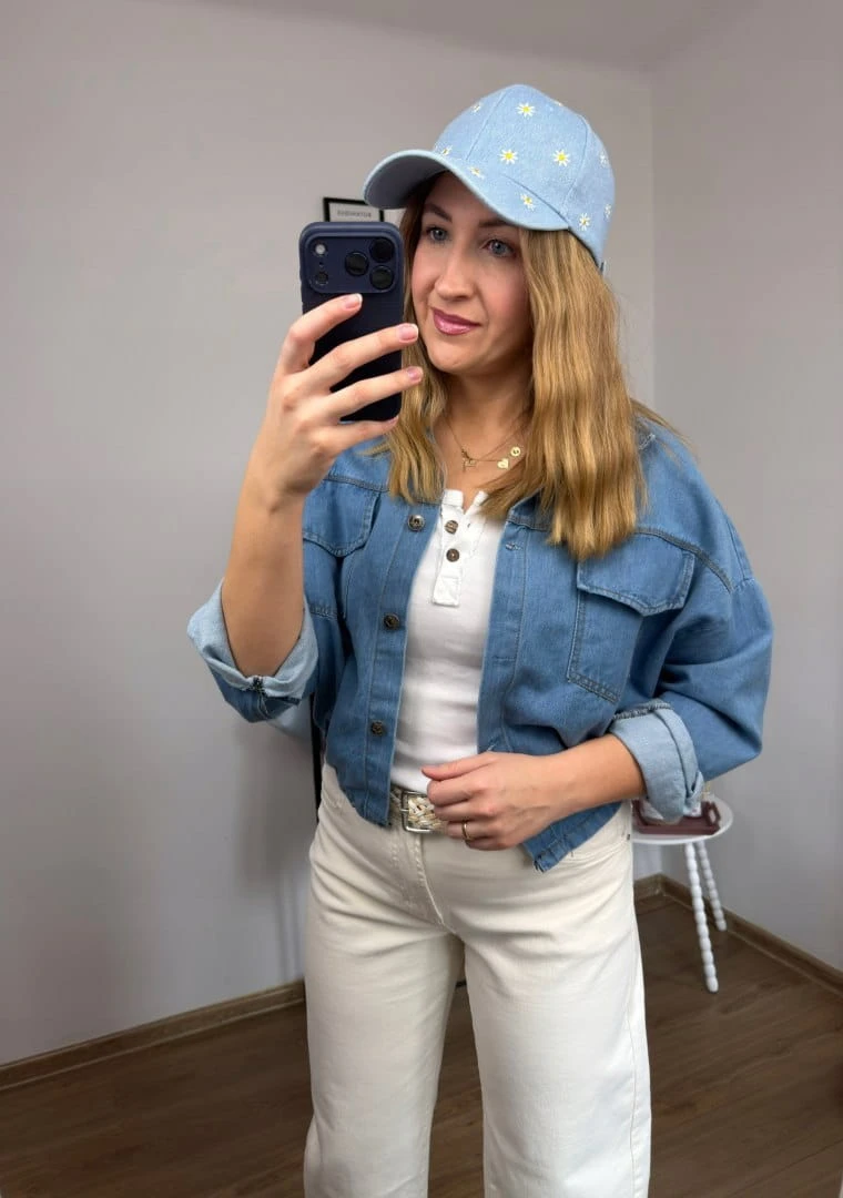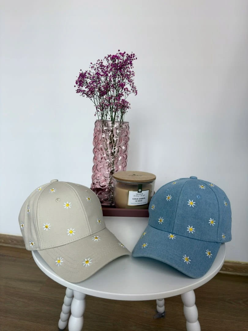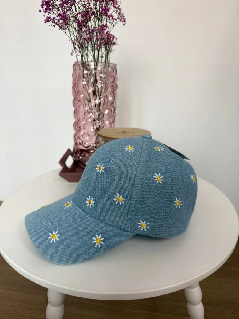 Stylowa czapka z daszkiem w subtelnym, niebieskim odcieniu jeansu, ozdobiona uroczym haftem w drobne stokrotki. To model, który idealnie łączy klasykę z dziewczęcym, lekkim akcentem.