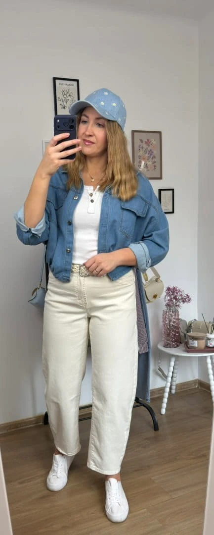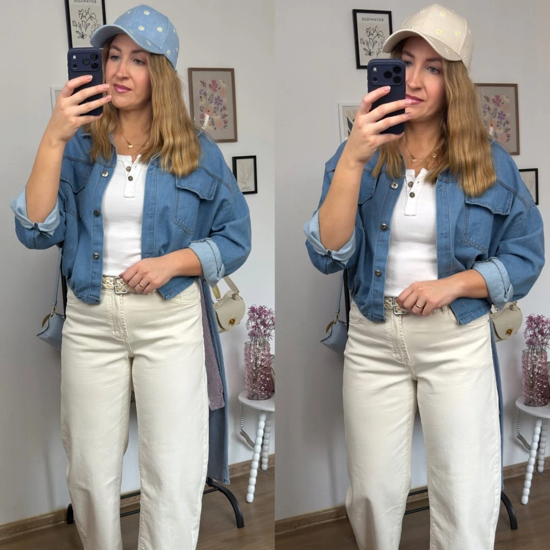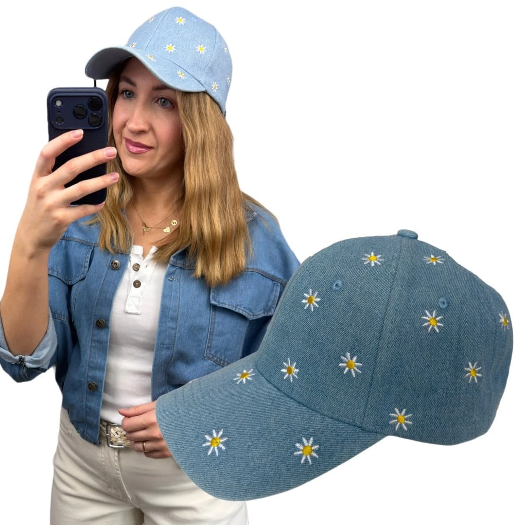 Stylowa czapka z daszkiem w subtelnym, niebieskim odcieniu jeansu, ozdobiona uroczym haftem w drobne stokrotki. To model, który idealnie łączy klasykę z dziewczęcym, lekkim akcentem.