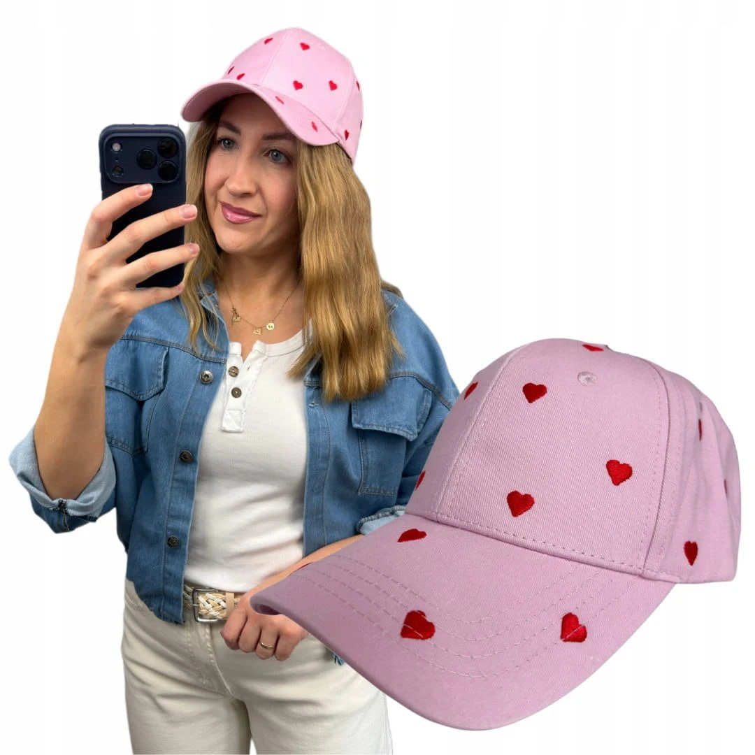 Bawełniana czapka damska z daszkiem różowa haft serduszka regulowana