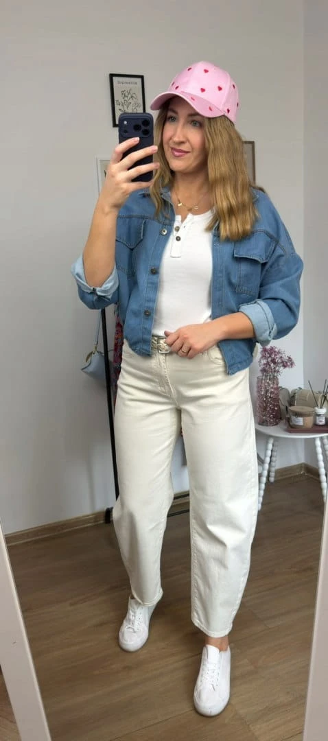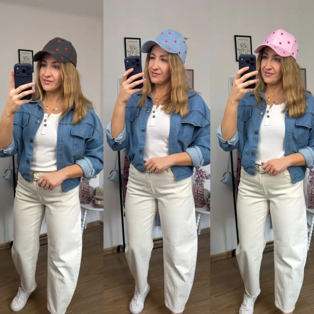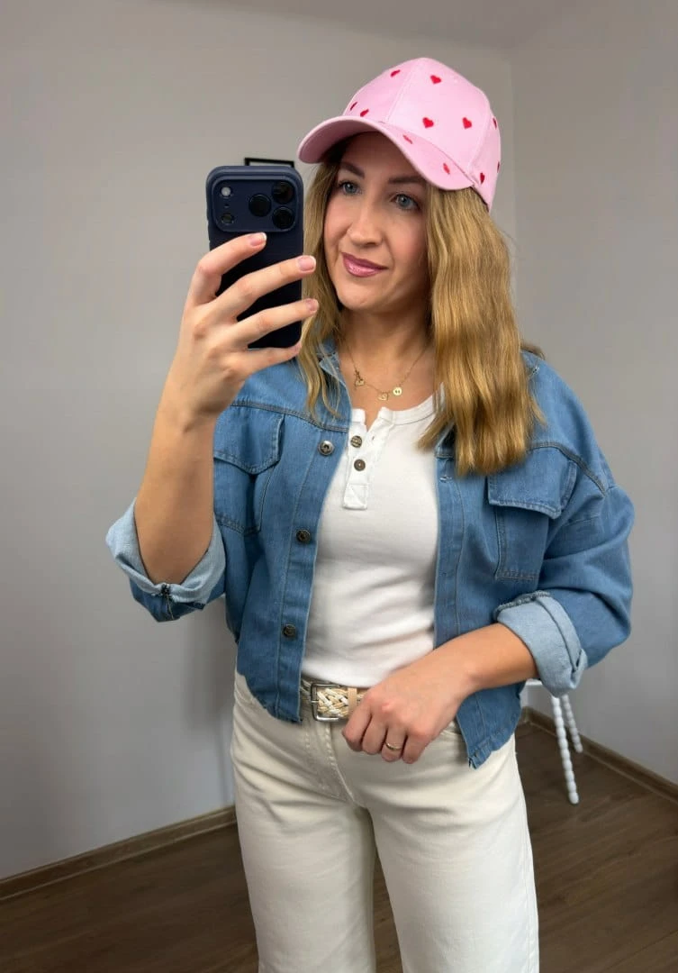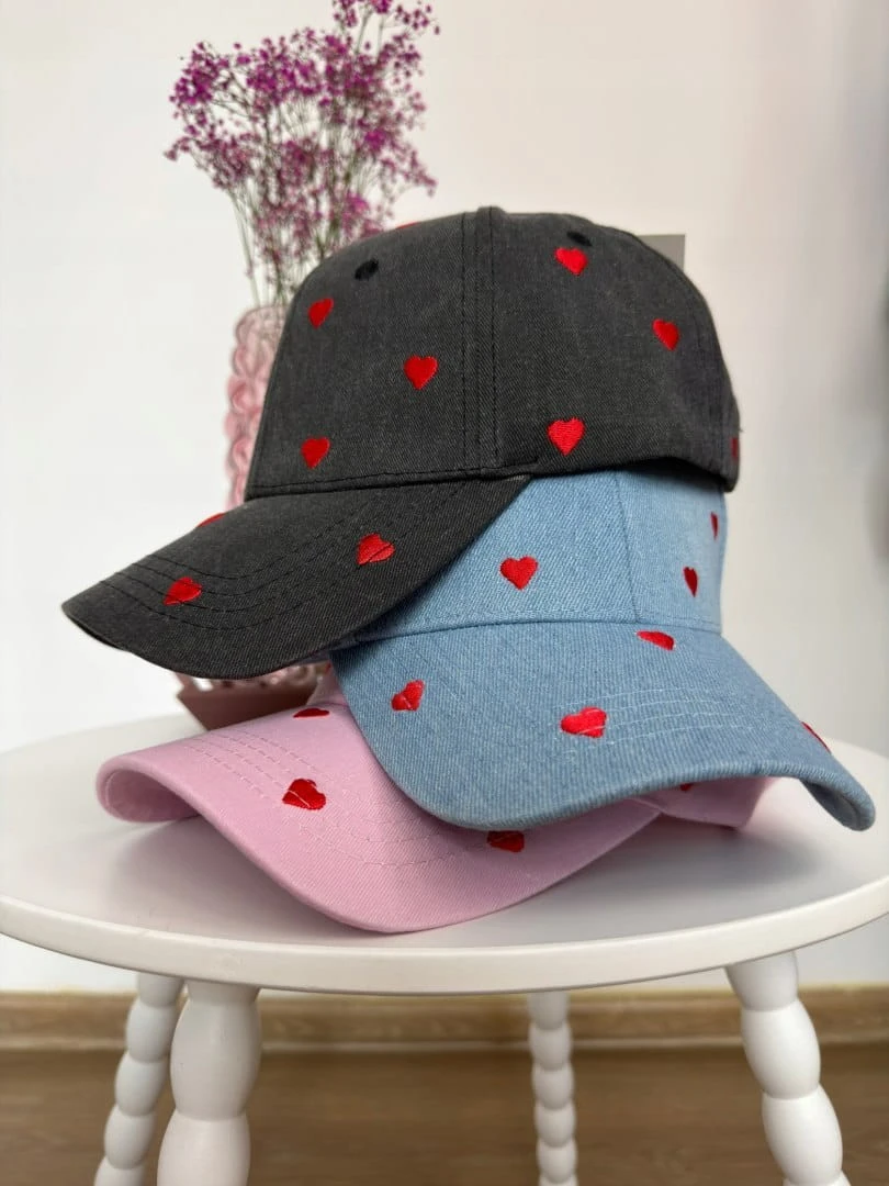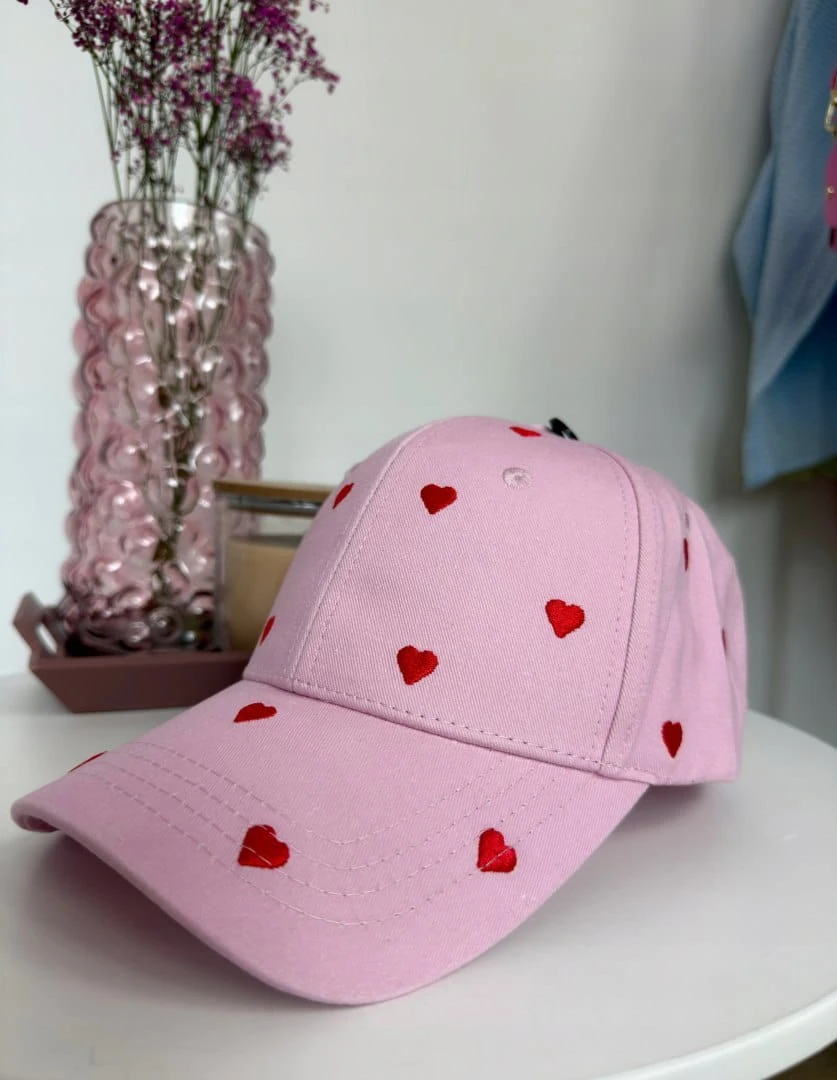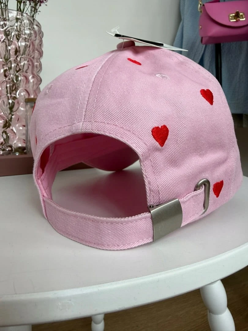 Stylowa czapka z daszkiem w subtelnym, różowym odcieniu, ozdobiona uroczym haftem w drobne serca. To model, który idealnie łączy klasykę z dziewczęcym, lekkim akcentem.