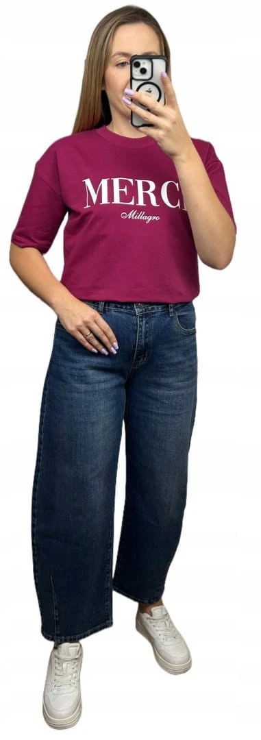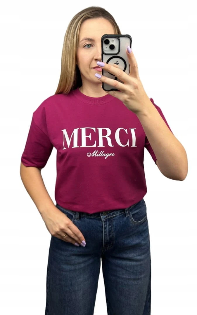 Buraczkowy t-shirt biały napis oversize bawełniany Millagro- MERCI