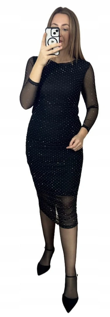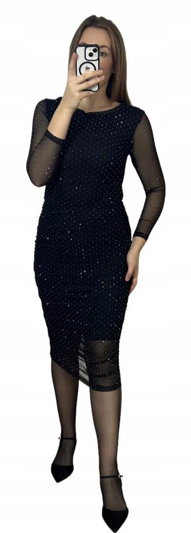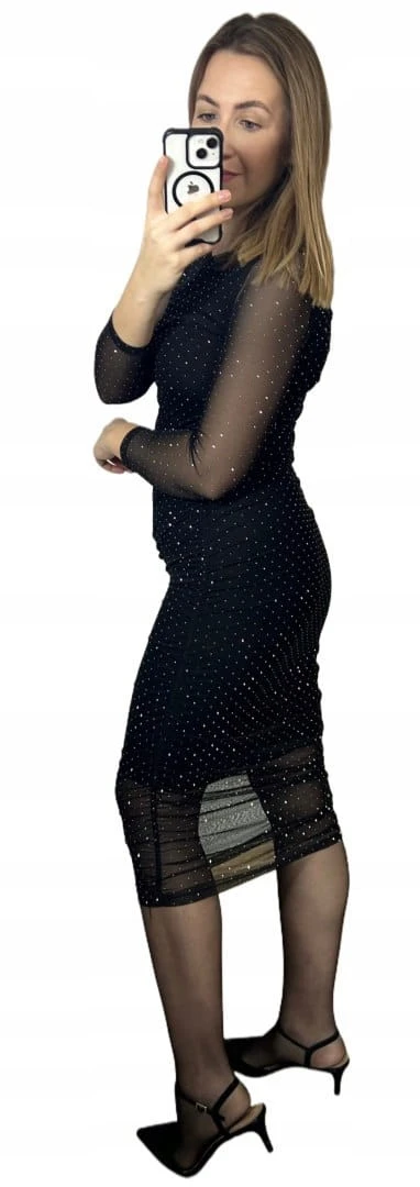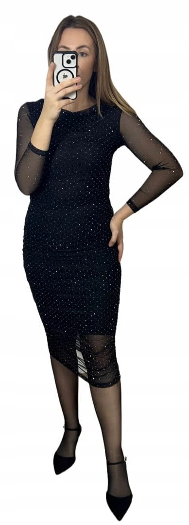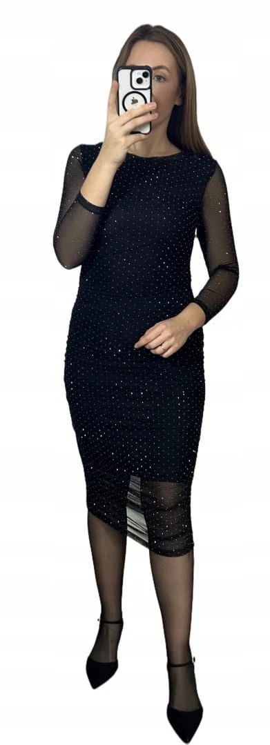 Zjawiskowa czarna sukienka midi wykonana z delikatnej siateczki, ozdobionej subtelnymi, błyszczącymi diamencikami. Model zachwyca eleganckim wyglądem i efektem WOW, idealnie sprawdzając się na wyjątkowe okazje.