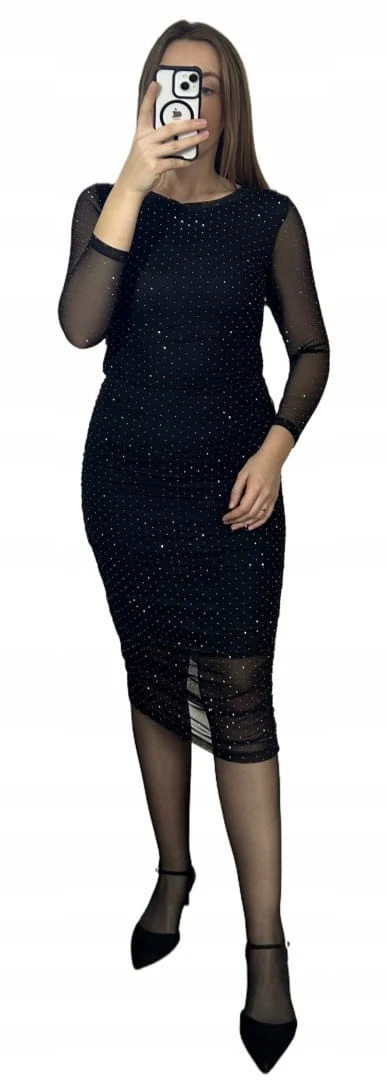 Czarna sukienka midi dłuższa siateczkowa siateczka marszczenia diamenciki- DIAMENZA