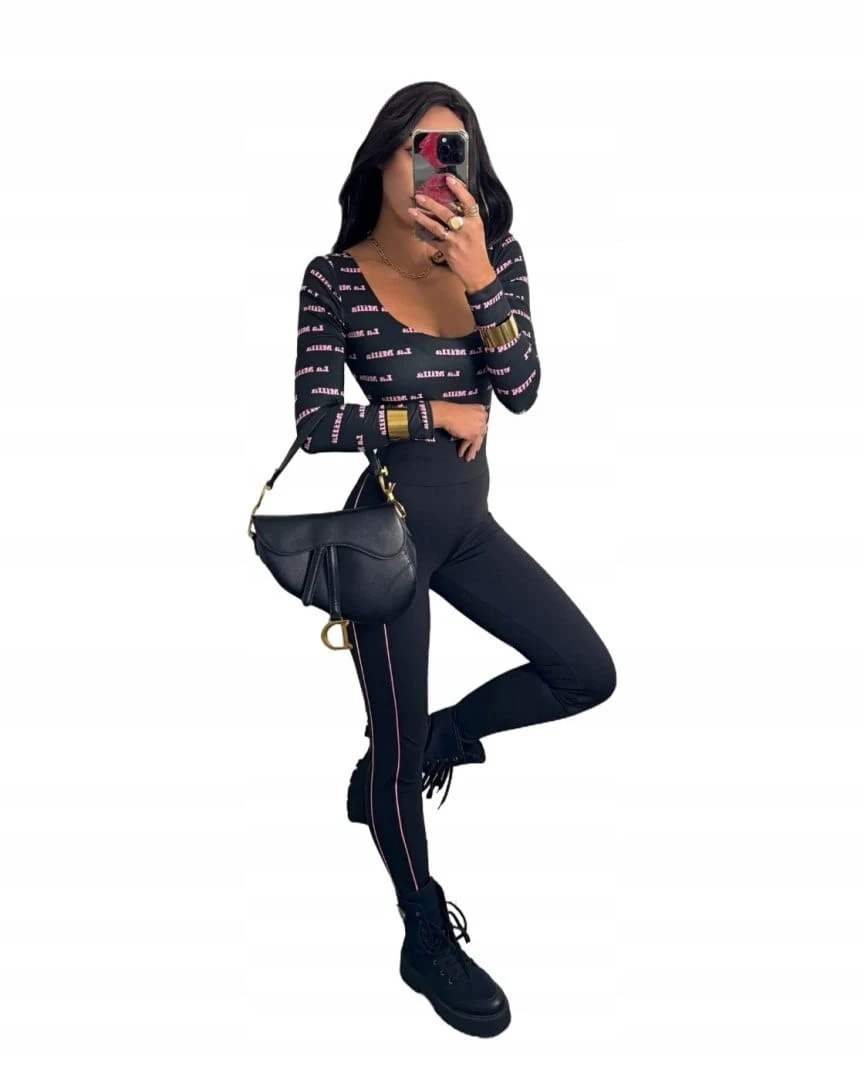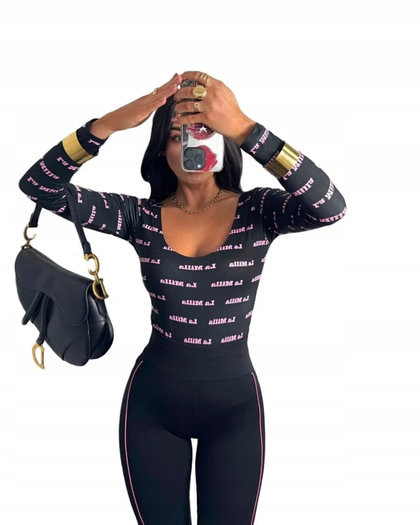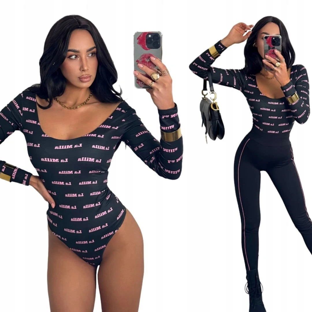 Czarne dopasowane body z napisami logowane długi rękaw La Milla M