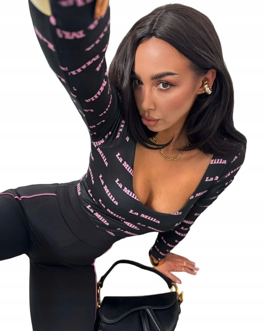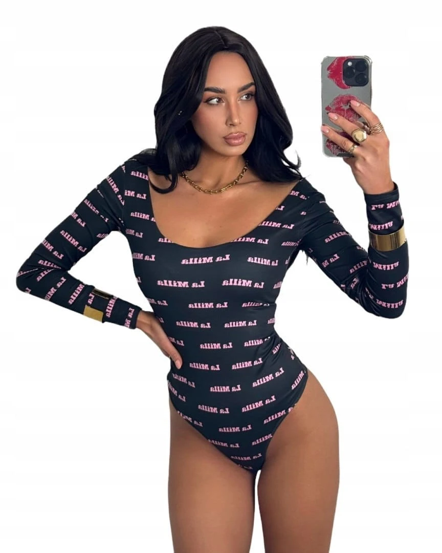 Czarne dopasowane body z napisami logowane długi rękaw La Milla S