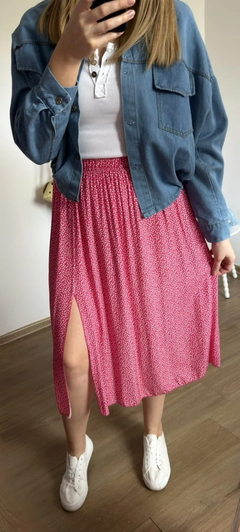 Dłuższa midi spódnica z rozcięciem wiskoza wiskozowa hit kropki różowa AURELIA