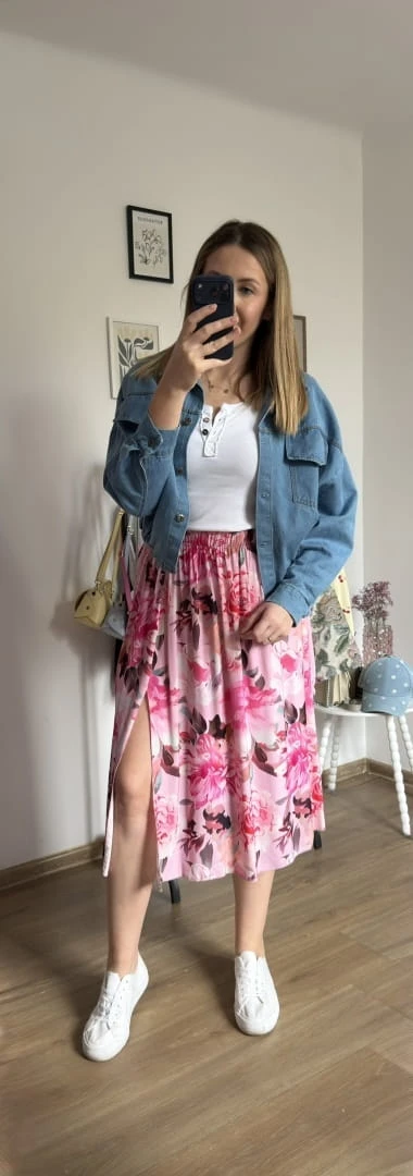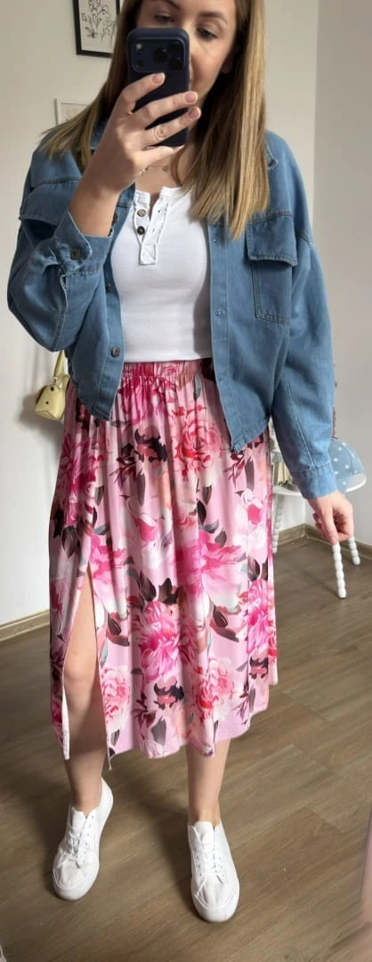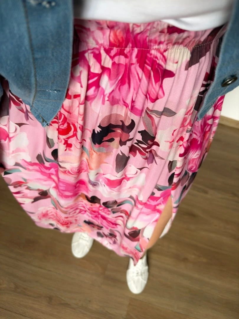 Dłuższa midi spódnica z rozcięciem wiskoza wiskozowa hit kwiaty różowa róż AURELIA
