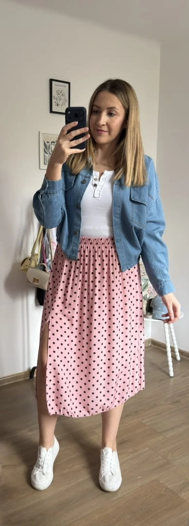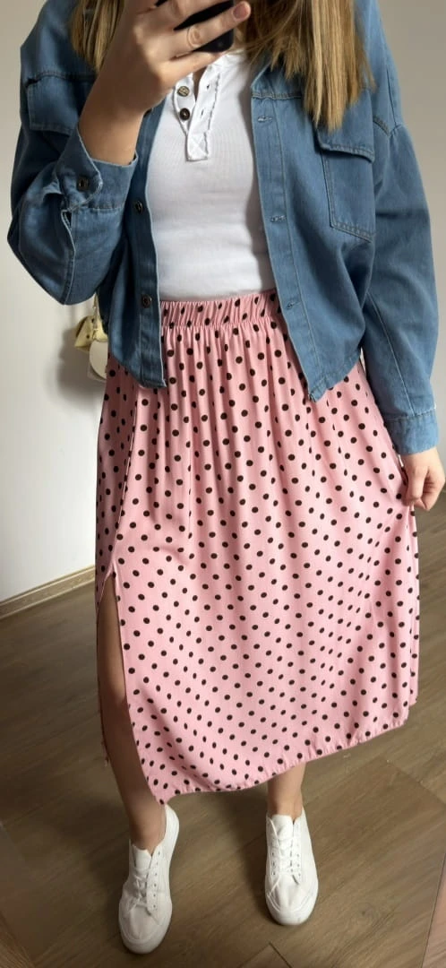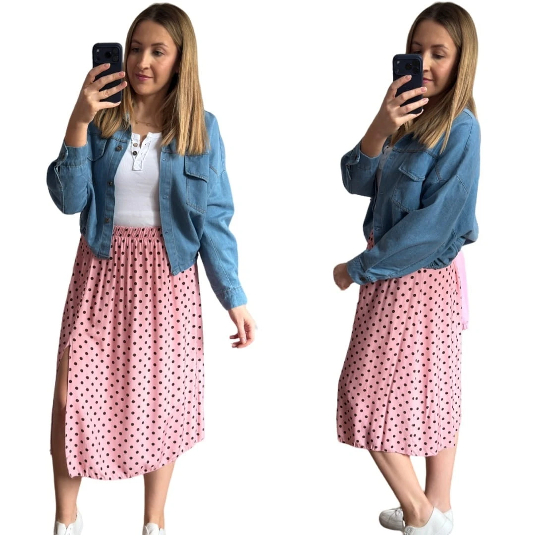 Dłuższa midi spódnica z rozcięciem wiskoza wiskozowa kropki różowa AURELIA