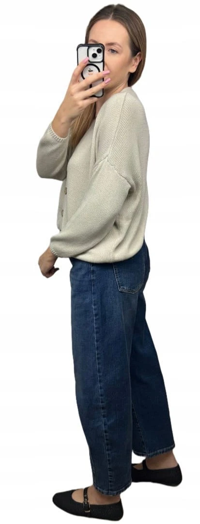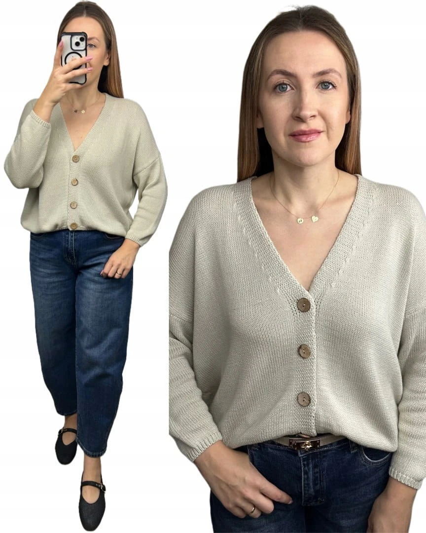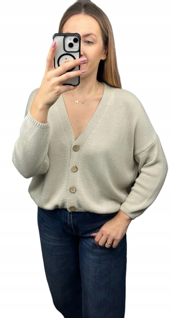 Ponadczasowy kardigan z naturalnej bawełny to idealny wybór na każdą porę roku. Wykonany z miękkiej dzianiny, zapewnia wygodę i przewiewność, a drewniane guziki dodają mu subtelnego, naturalnego charakteru. Luźniejszy krój z lekko opuszczoną linią ramion sprawia, że sweter wygląda stylowo zarówno w casualowych, jak i eleganckich zestawach.
