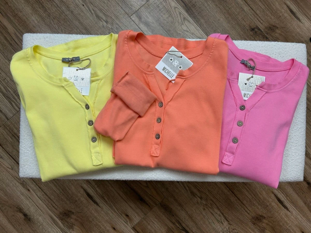 Model z dekoltem zapinanym na guziki. Dół bluzki wykończony na półokrągło.