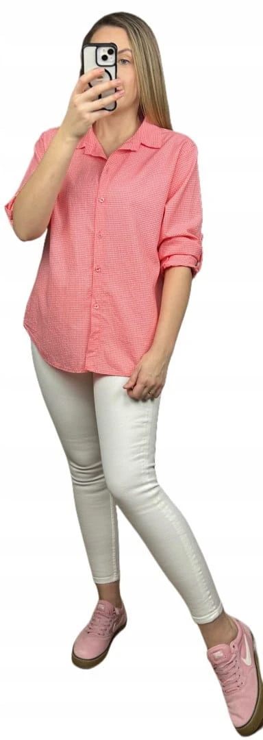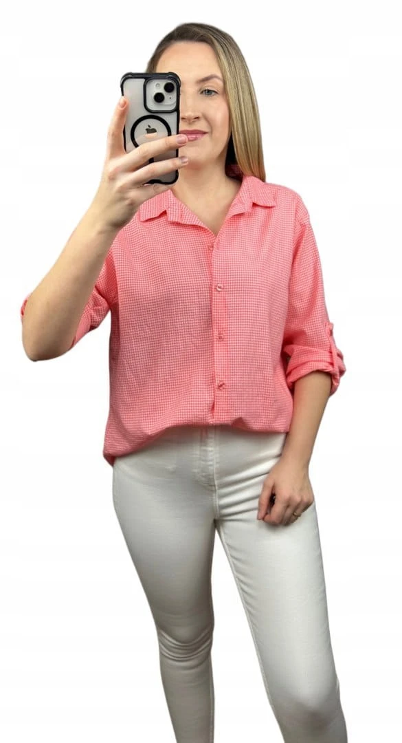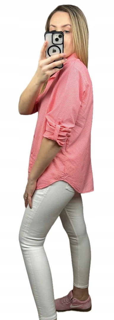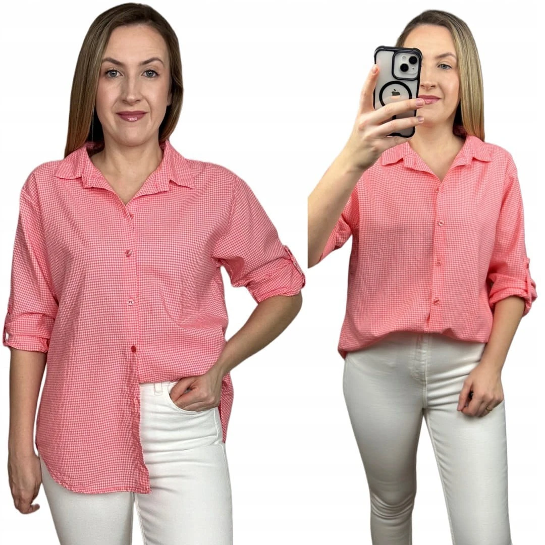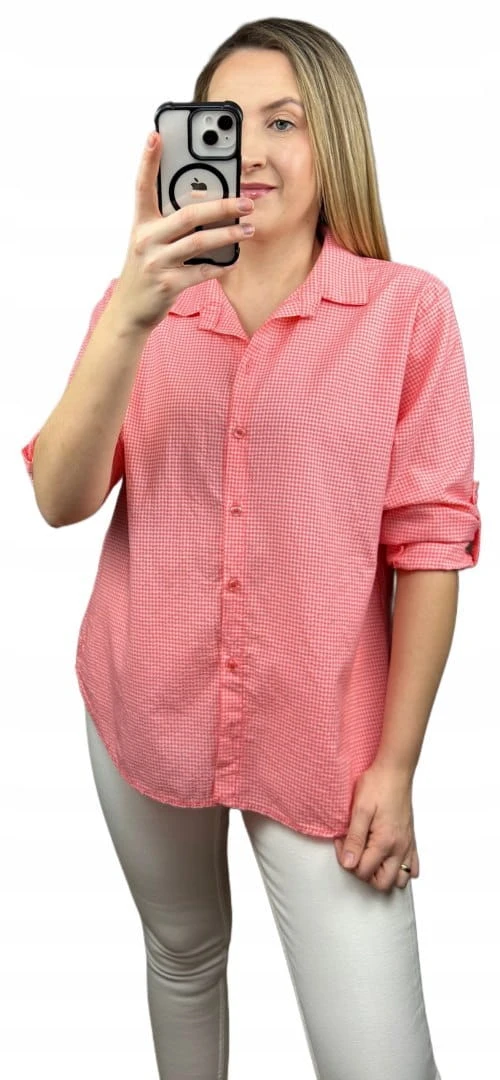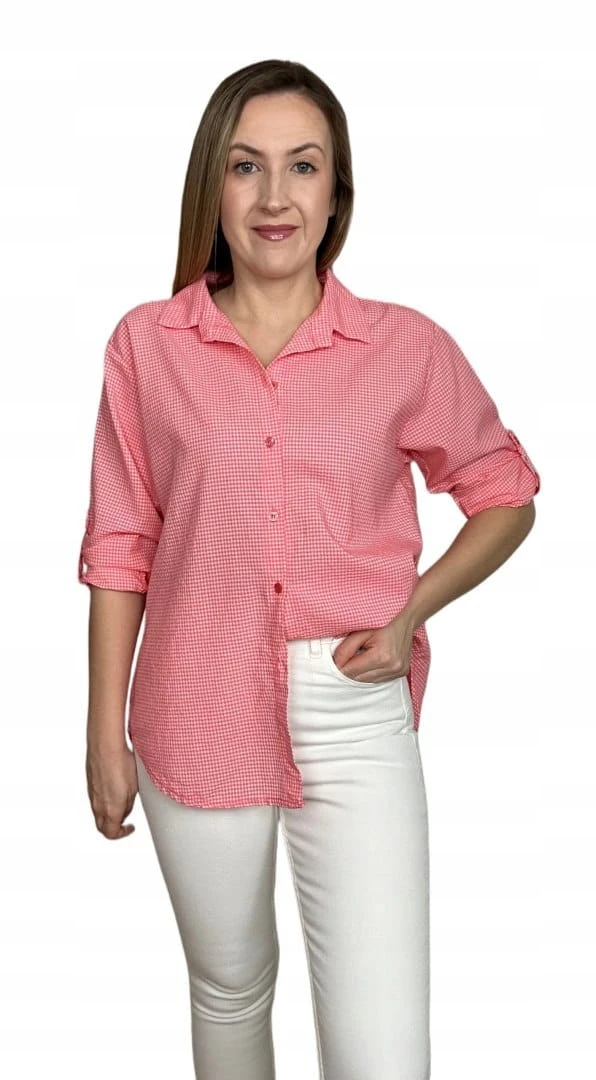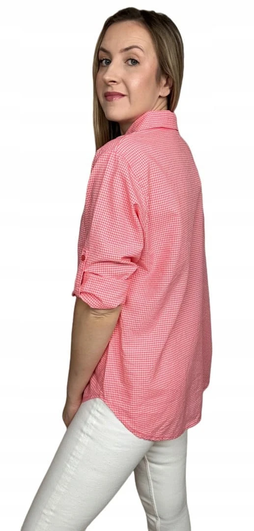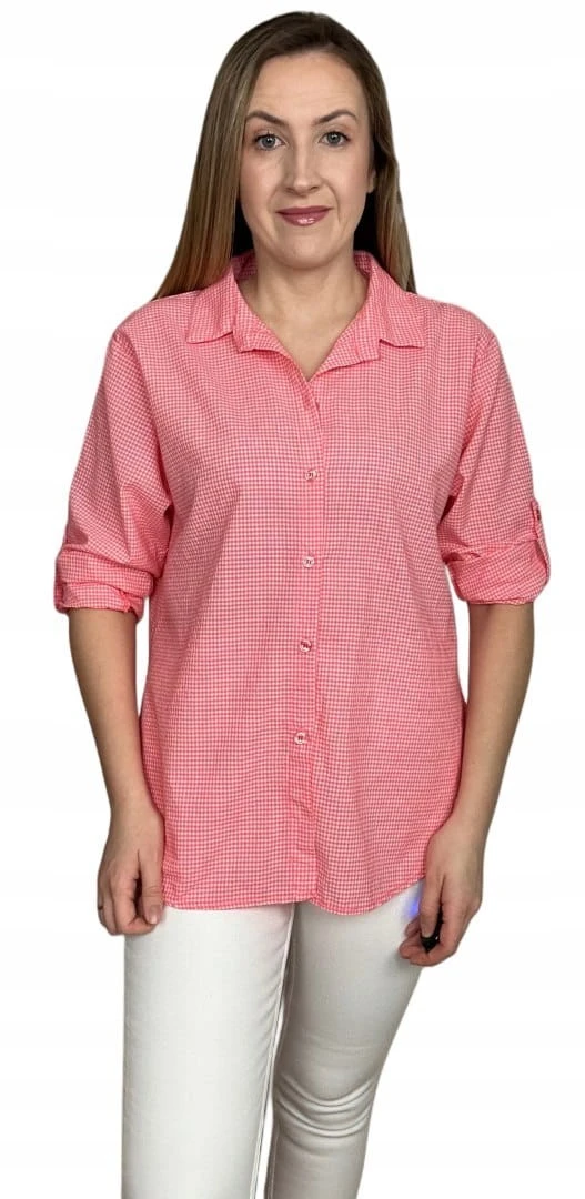 Klasyczna koralowa koszula w kratkę pastelowa wywijany rękaw bawełniana