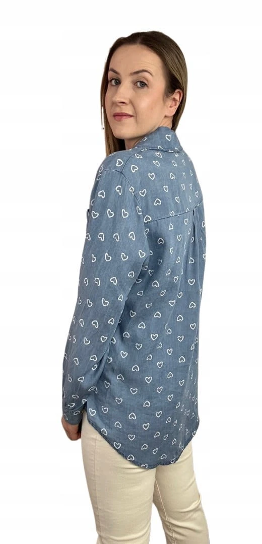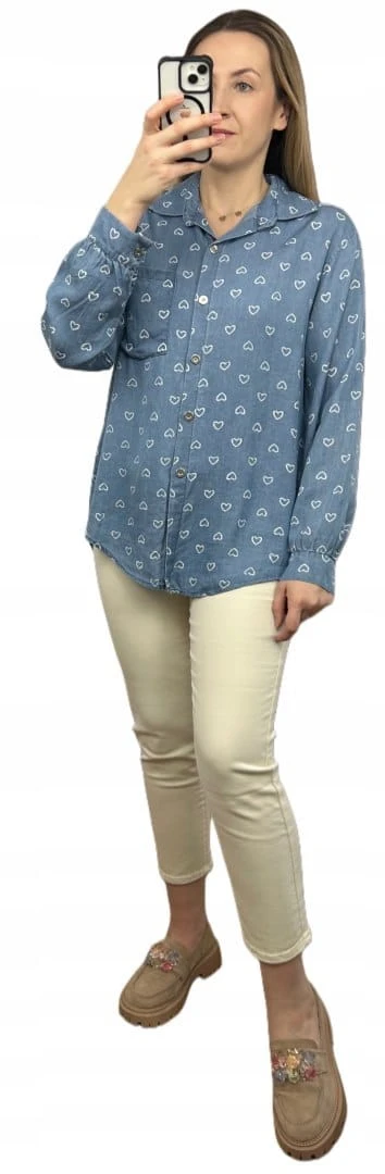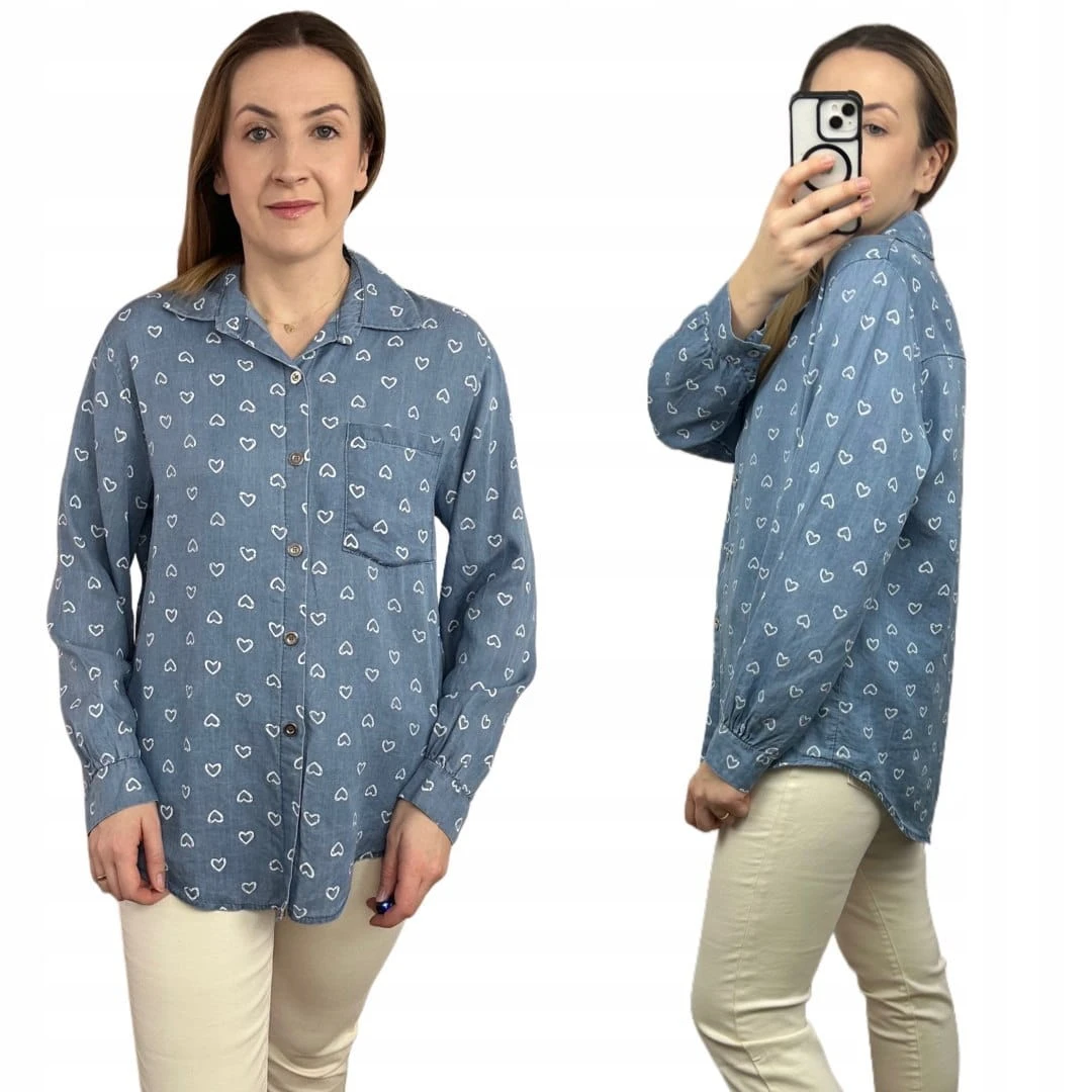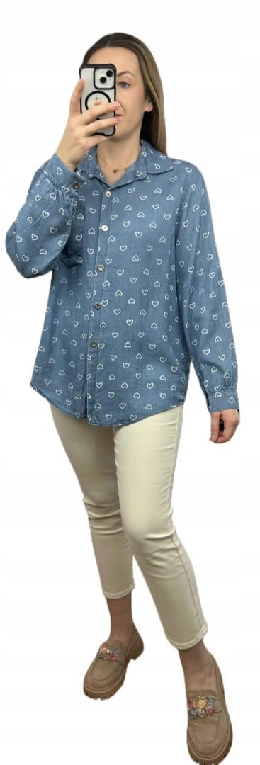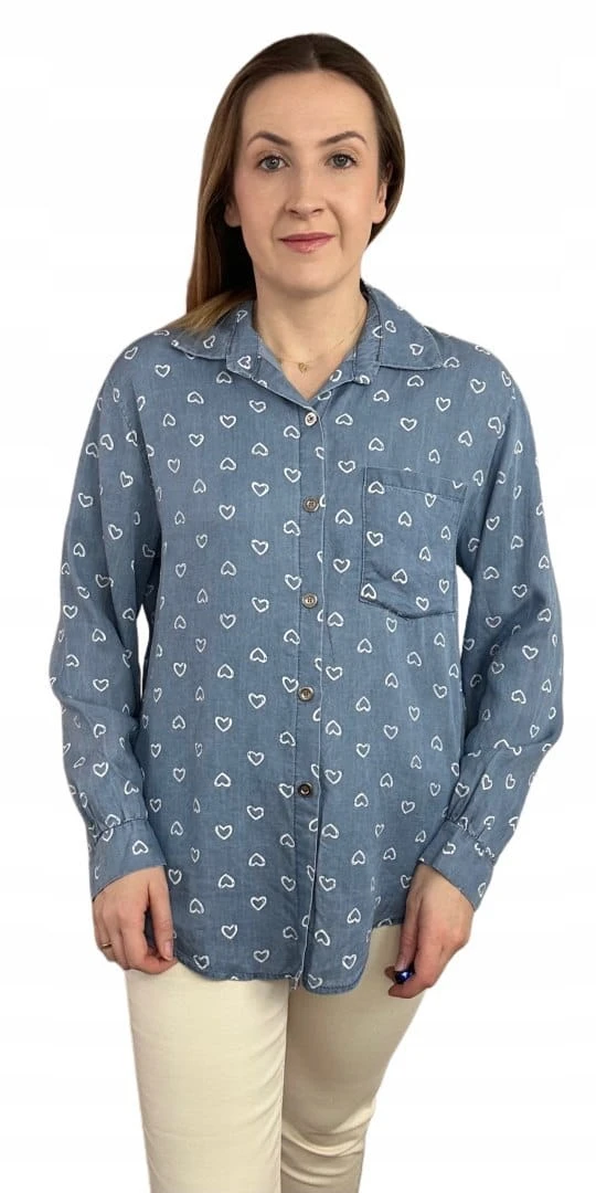 Stylowa koszula jeansowa z cienkiego jeansu o luźnym kroju z uroczym wzorem serc. To idealny wybór dla kobiet ceniących wygodę i modny wygląd. Włoska produkcja zapewnia wysoką jakość wykonania, a uniwersalny fason sprawia, że pasuje do różnych sylwetek. Doskonała zarówno na co dzień, jak i na bardziej eleganckie okazje w połączeniu z odpowiednimi dodatkami.