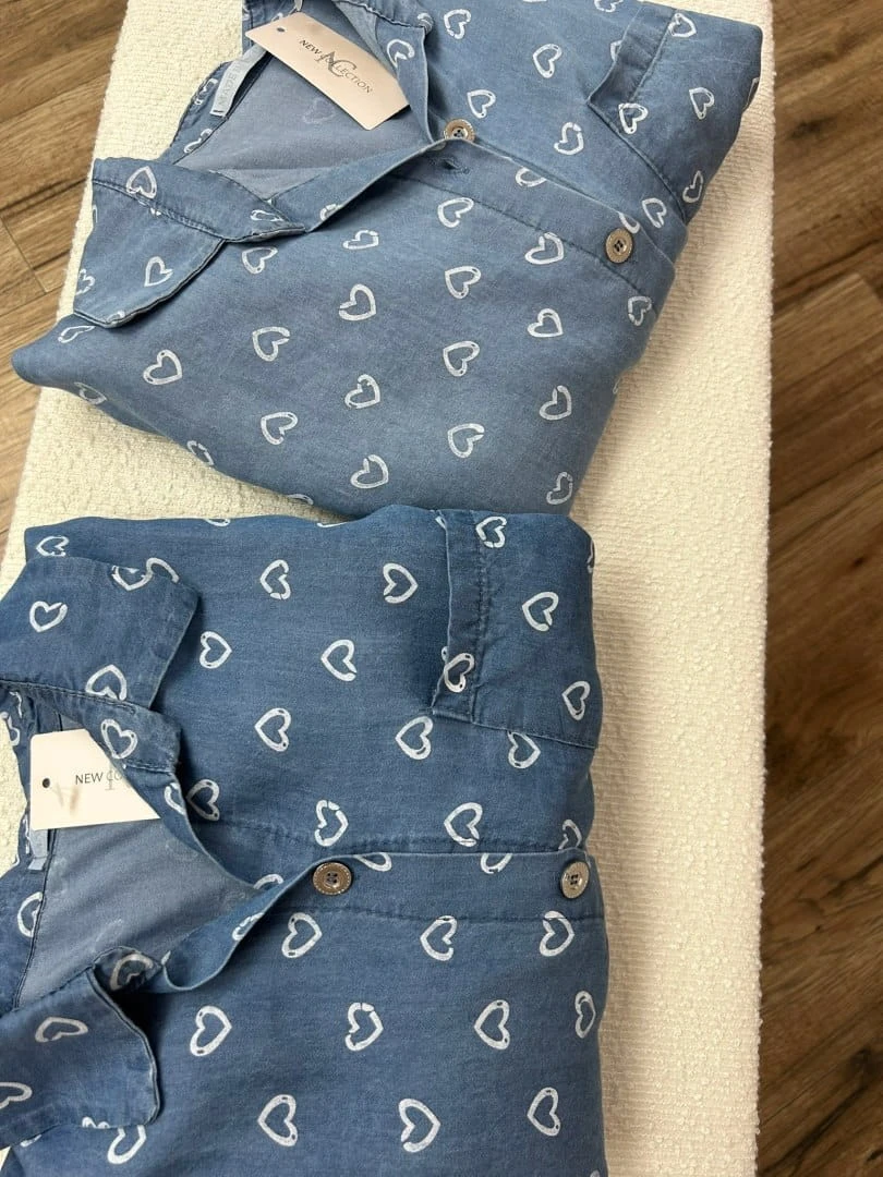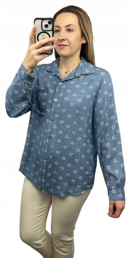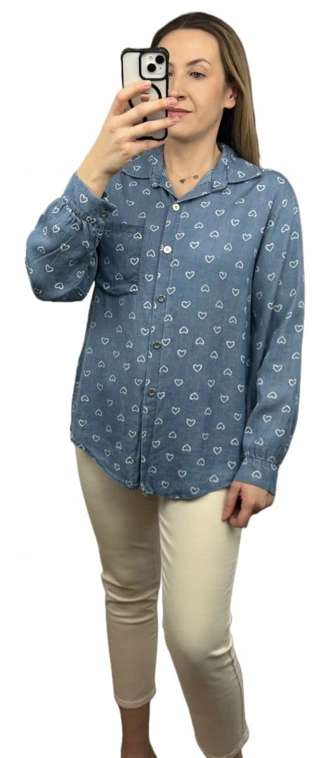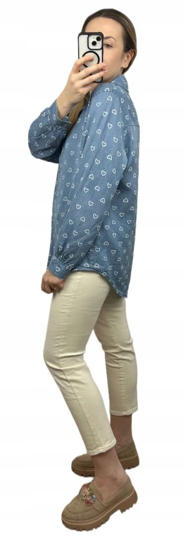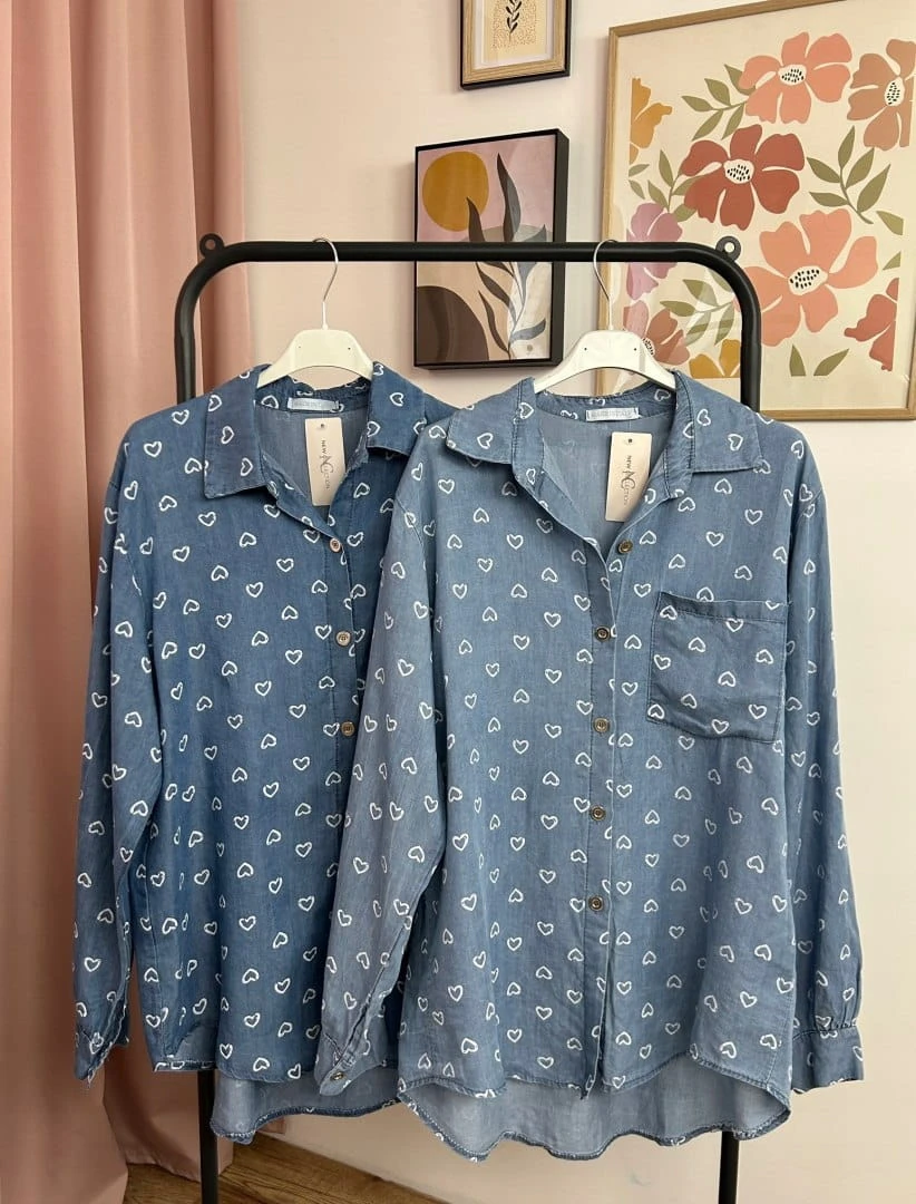 Stylowa koszula jeansowa z cienkiego jeansu o luźnym kroju z uroczym wzorem serc. To idealny wybór dla kobiet ceniących wygodę i modny wygląd. Włoska produkcja zapewnia wysoką jakość wykonania, a uniwersalny fason sprawia, że pasuje do różnych sylwetek. Doskonała zarówno na co dzień, jak i na bardziej eleganckie okazje w połączeniu z odpowiednimi dodatkami.
