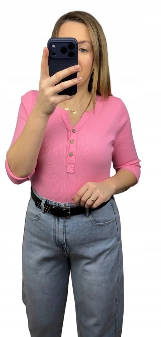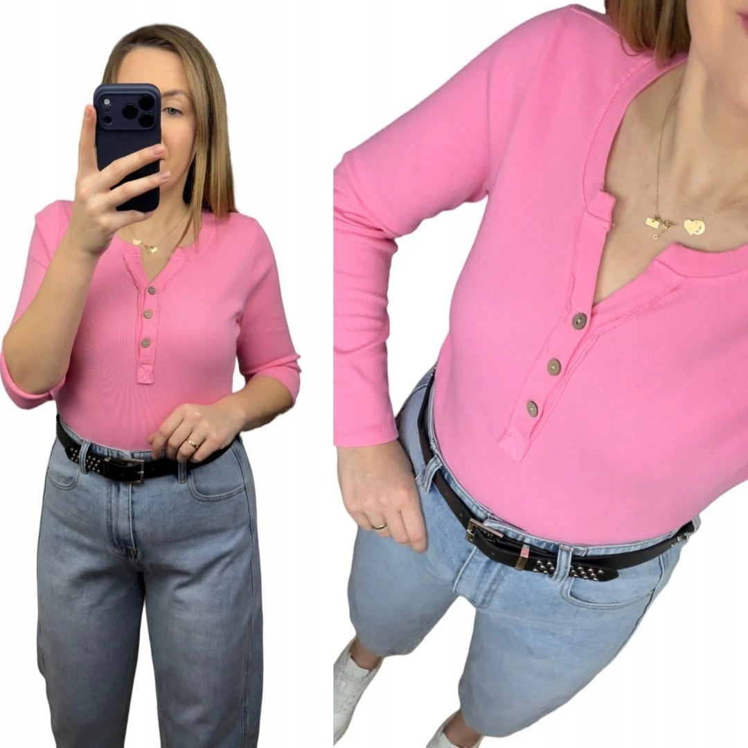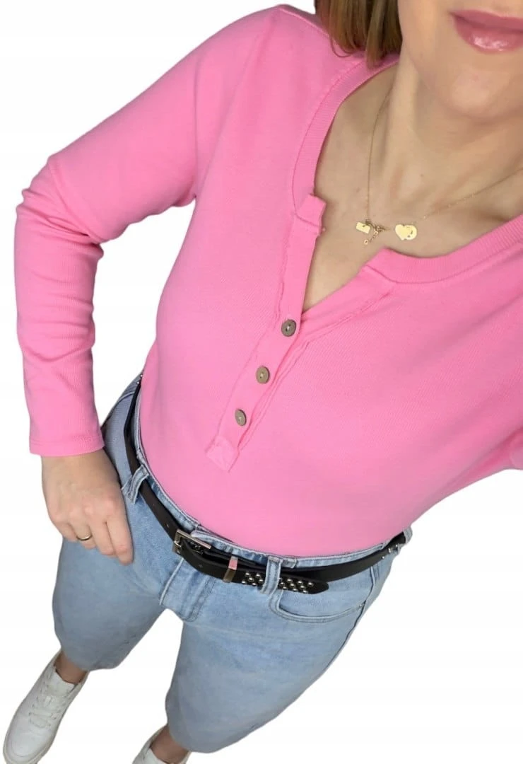 Klasyczna różowa róż bluzka damska prążkowana guziki bawełna Michelle- BASIC RIB
