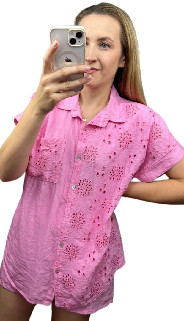 Luźna koszula posiada krótki rękaw oraz kieszeń na piersi. Dół zakończony na półokrągło.