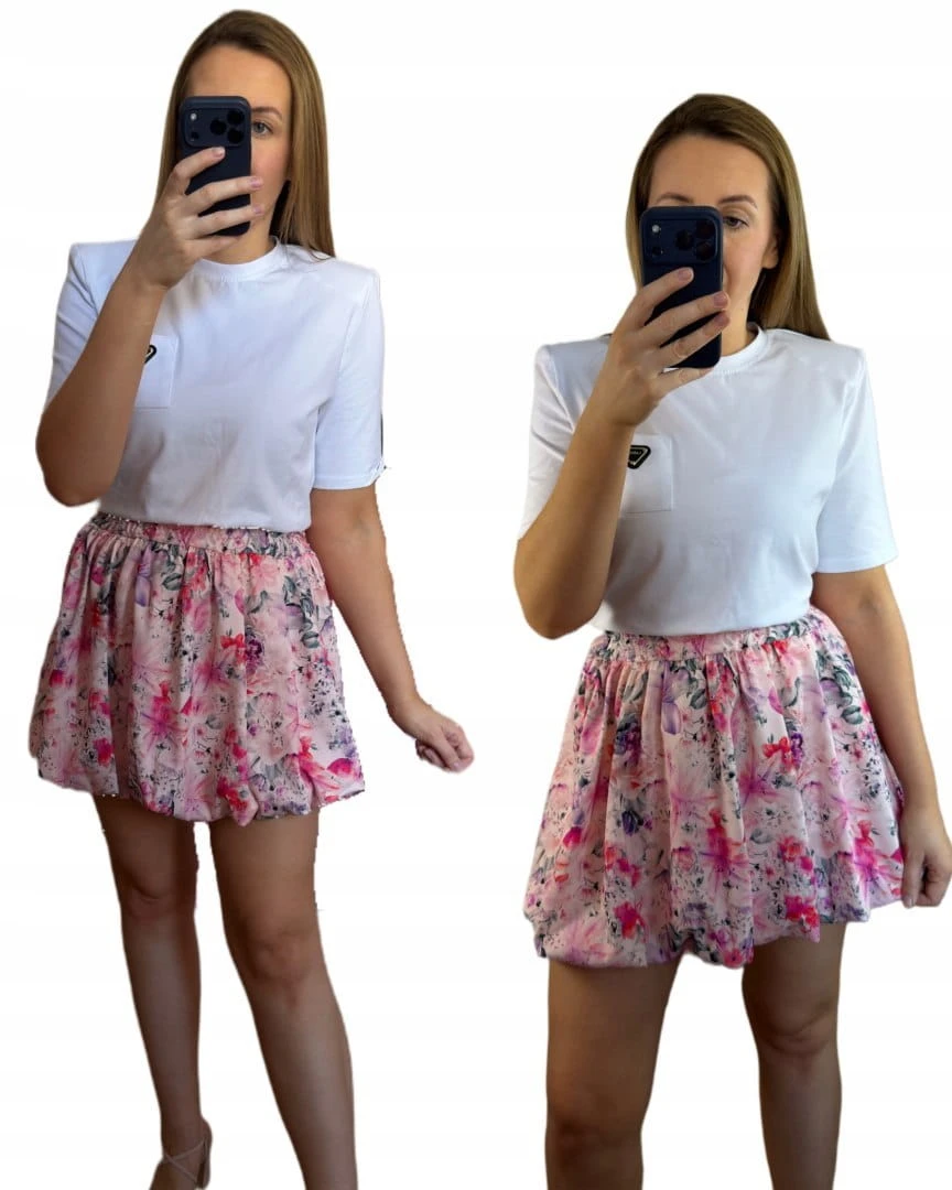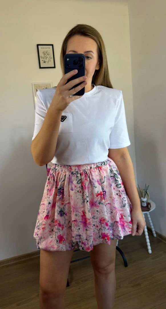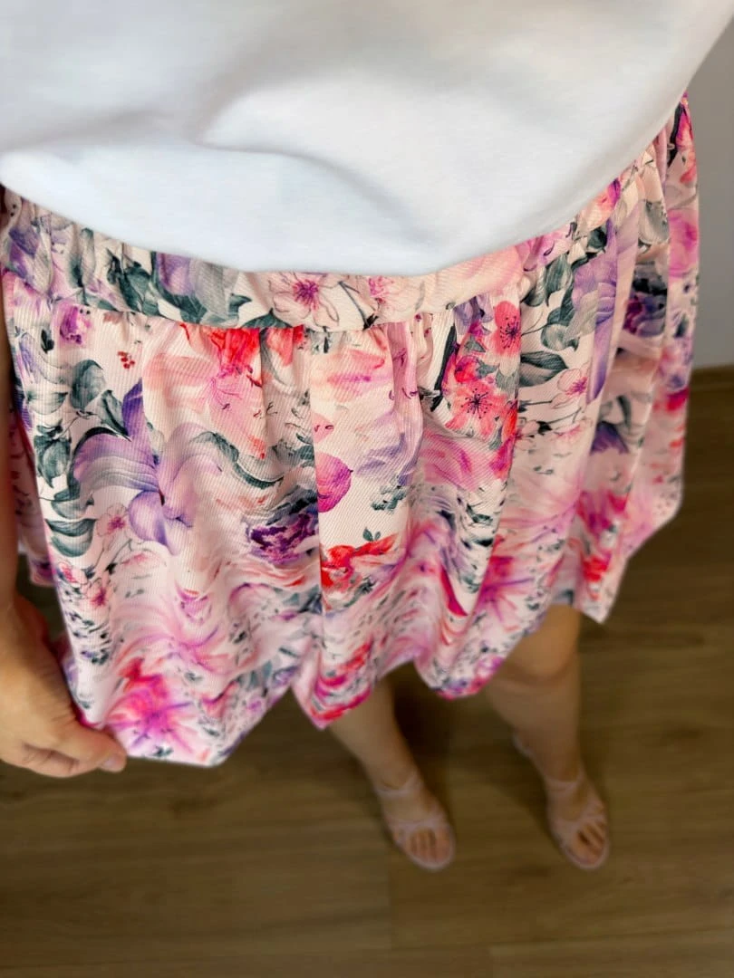 Krótka spódnica bombka wzorzysta luźna w różowe kwiaty kwiatki