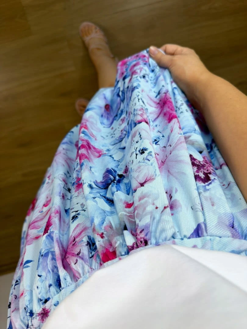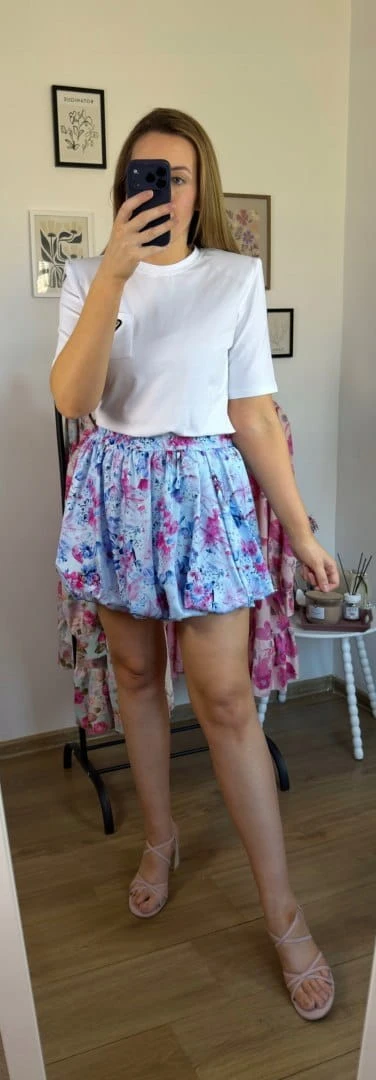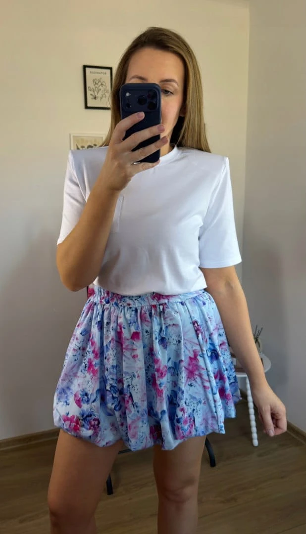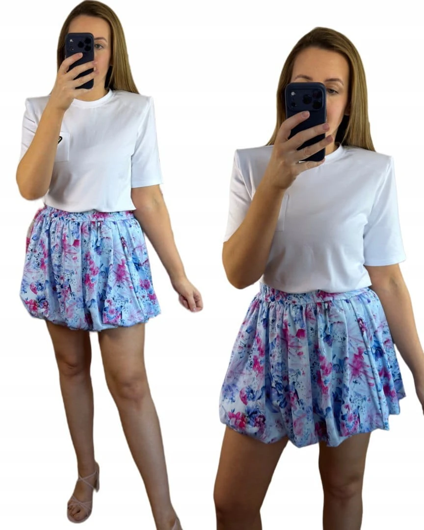 Krótka spódnica bombka wzorzysta luźna w różowe kwiaty kwiatki błękitna