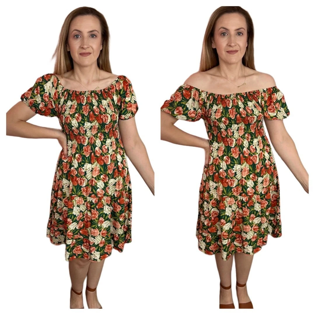 Krótka sukienka którą można nosić na ramionach, bądź jako hiszpankę.