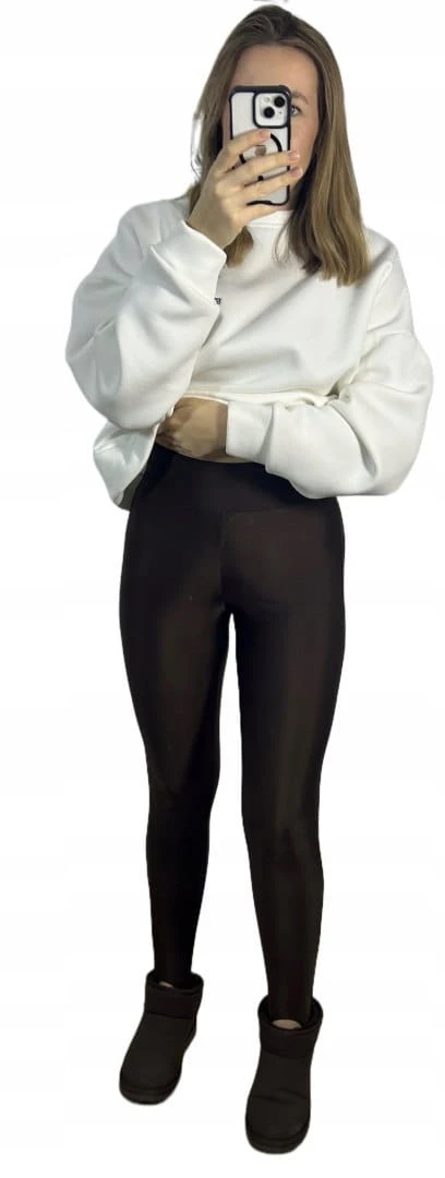 Ultra błyszczące, elastyczne i lekko lśniące legginsy typu „narciarki” z charakterystyczną zapiętką, która trzyma nogawkę na miejscu i optycznie wydłuża nogi.