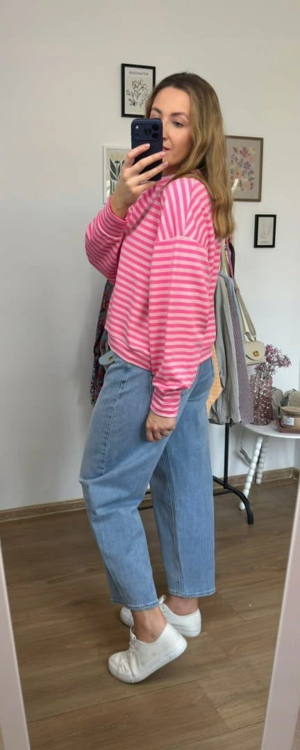 Lekka luźna bluza w poziome paski różowa haft Mooij- AMORE PARIS