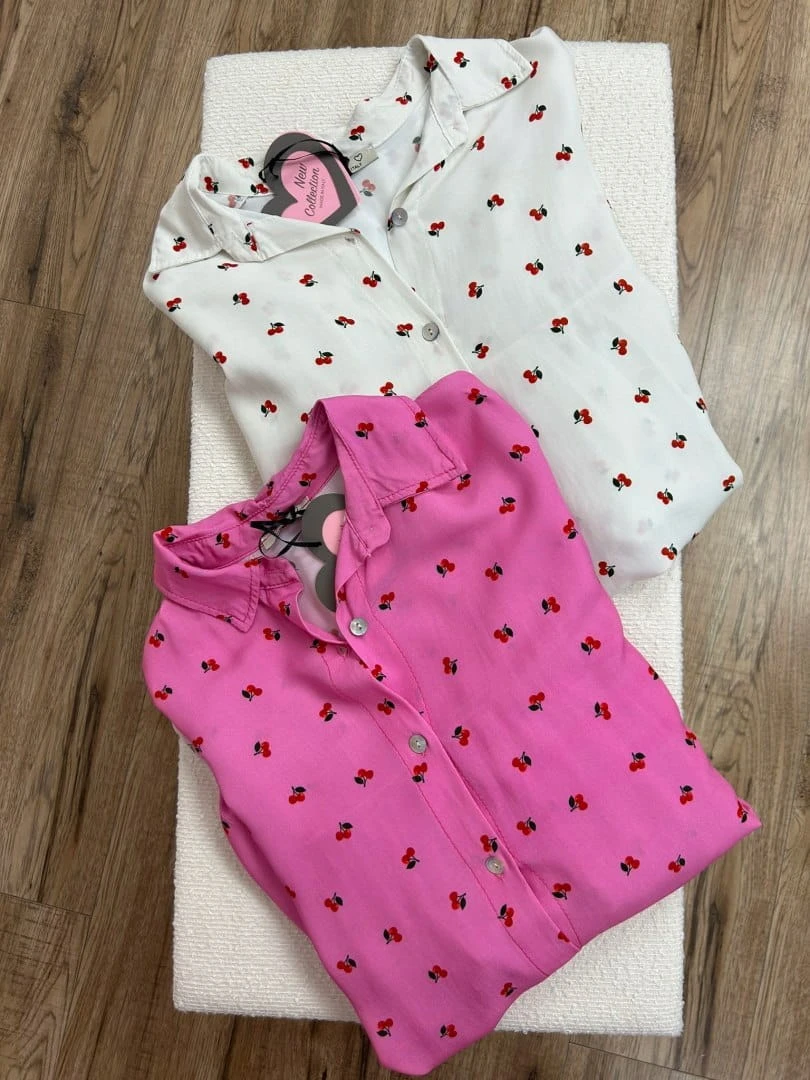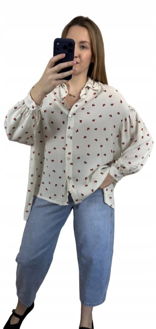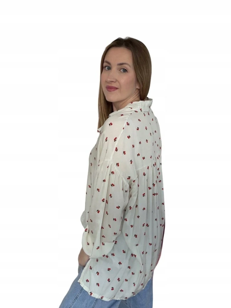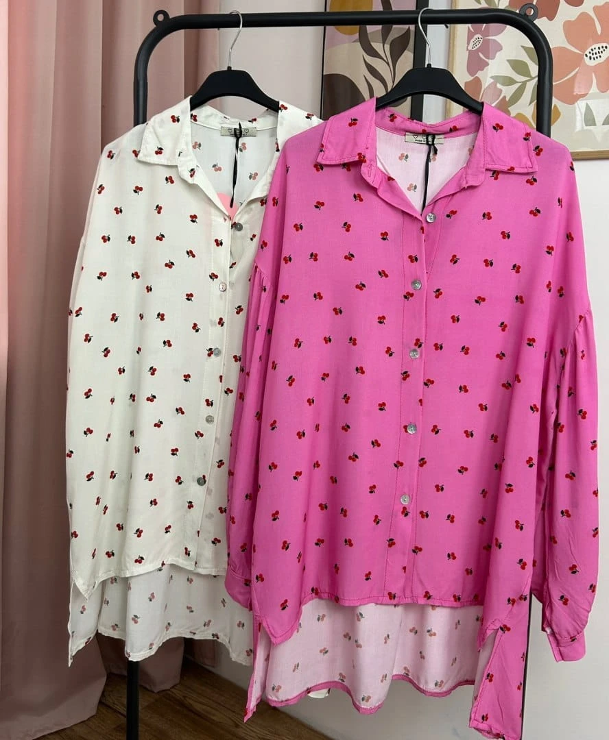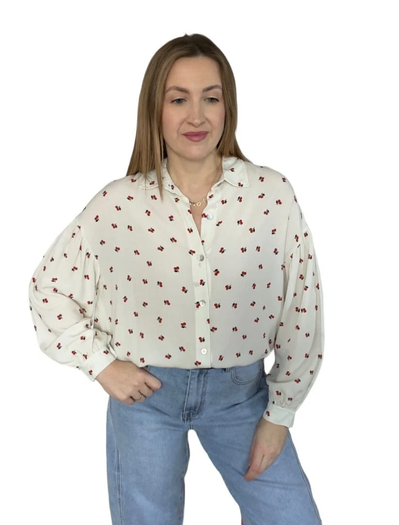 Luźna beżowa koszula oversize wiśnie wisienki 100% wiskoza kołnierzyk- CHERRY BLOOM
