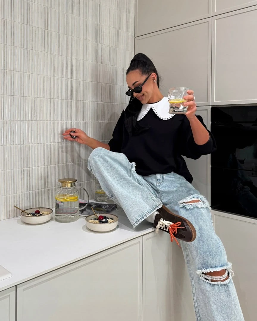 Wiązanie z tyłu stanowi efektowny detal oraz pozwala na delikatną regulację ułożenia kołnierzyka. Bluza doskonale łączy wygodę z modowym designem – sprawdzi się zarówno w codziennych stylizacjach, jak i w bardziej fashionowych zestawach.