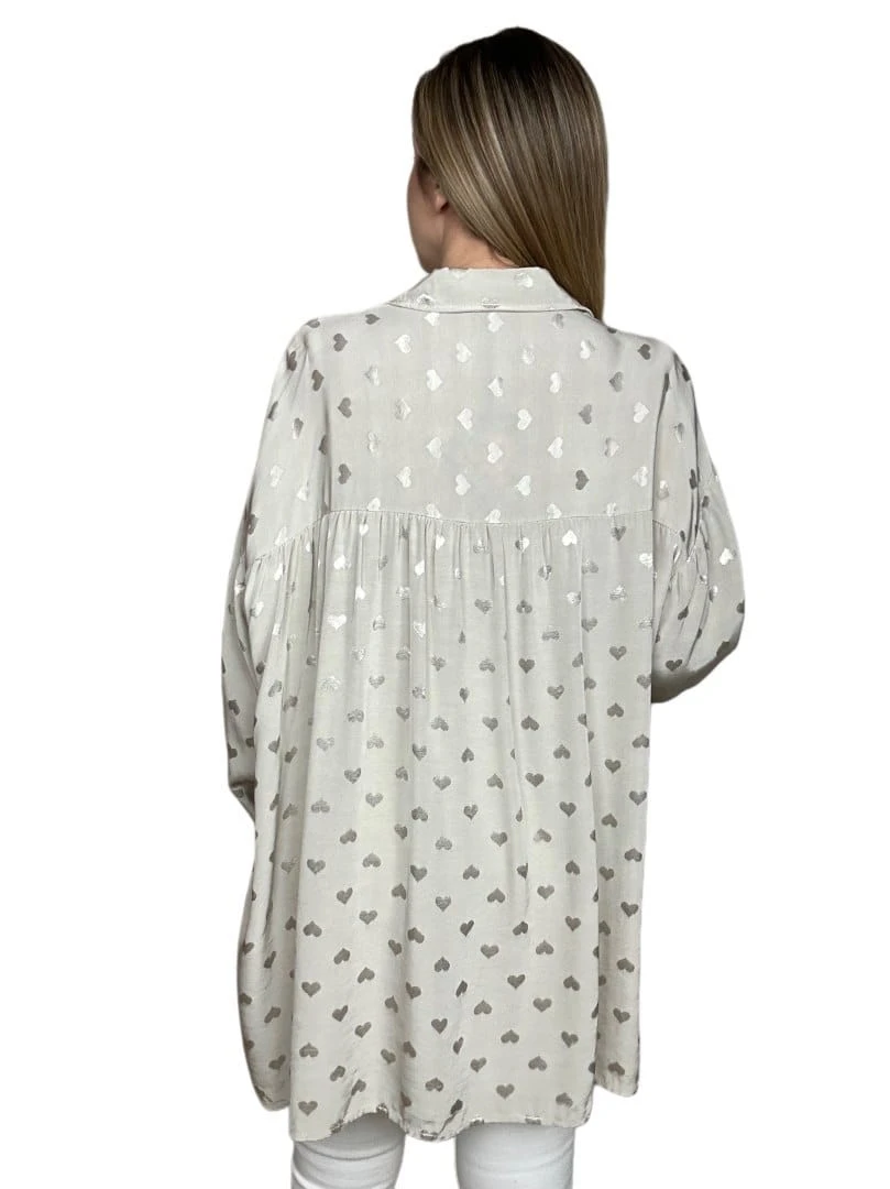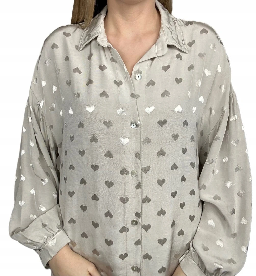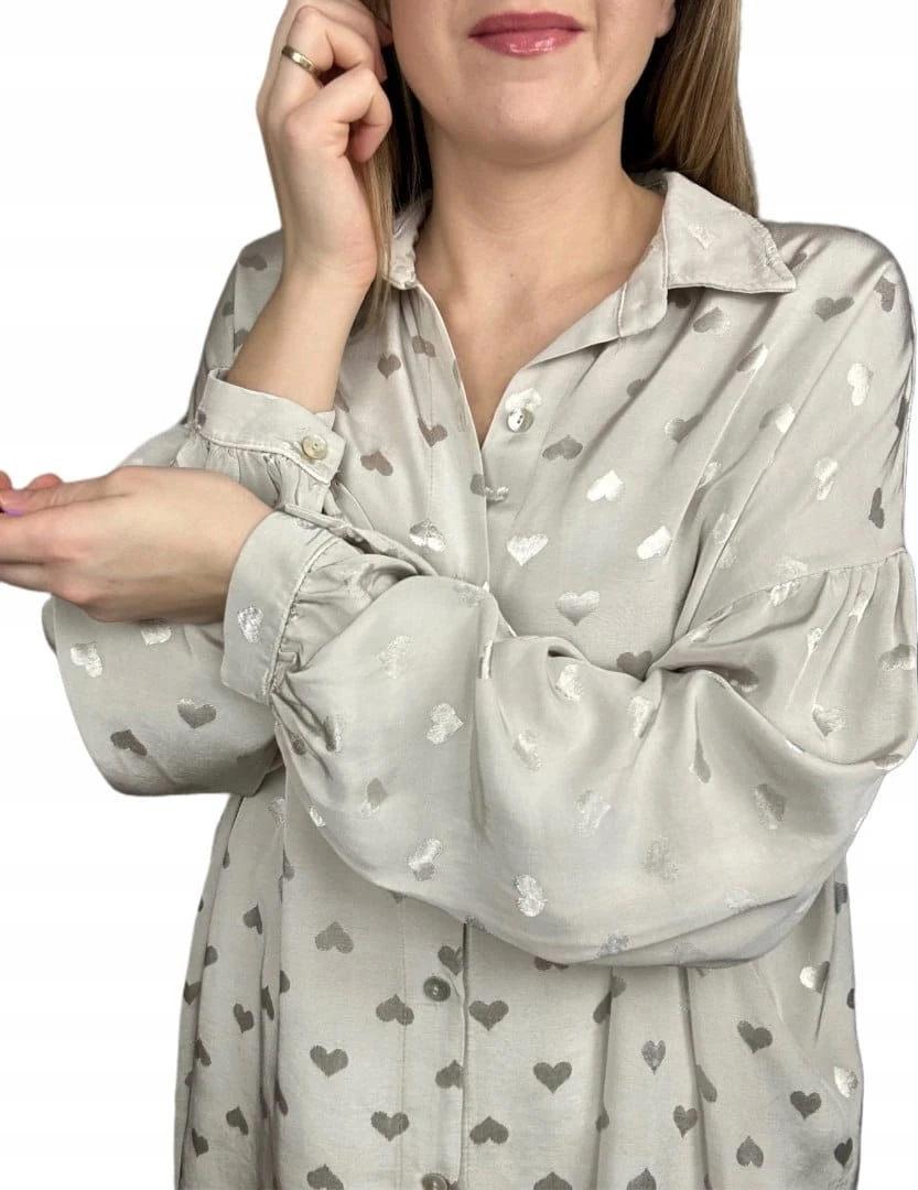 Koszula z kołnierzykiem o fasonie oversize, wykonana ze 100% jedwabiu w serduszka.Koszula posiada obniżoną linie ramion.