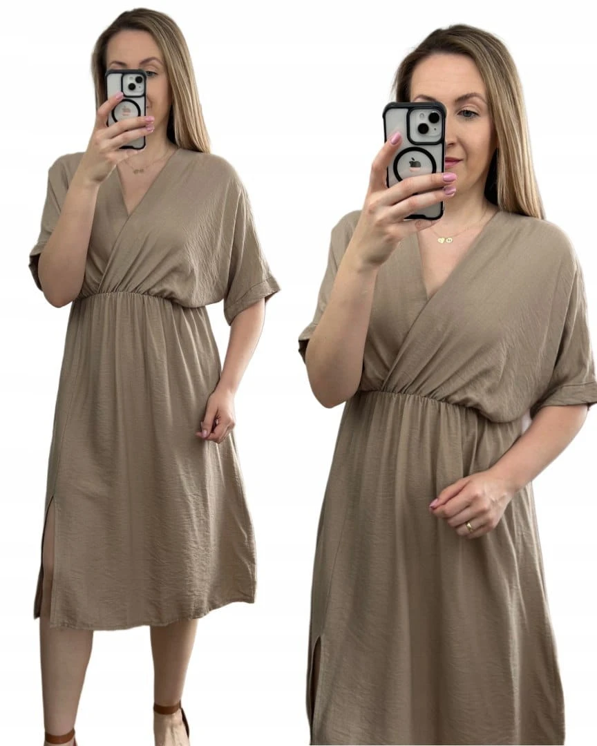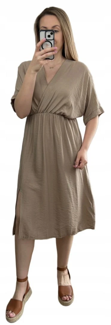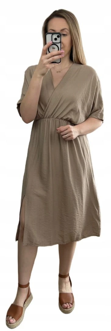 Luźna wiskozowa sukienka midi z rozcięciem kopertowy dekolt wiskoza fango