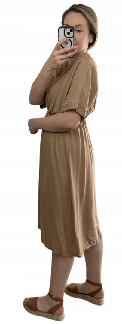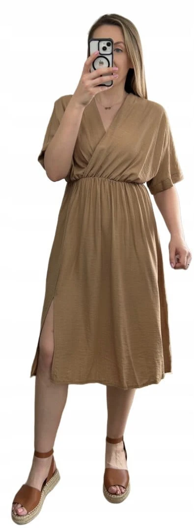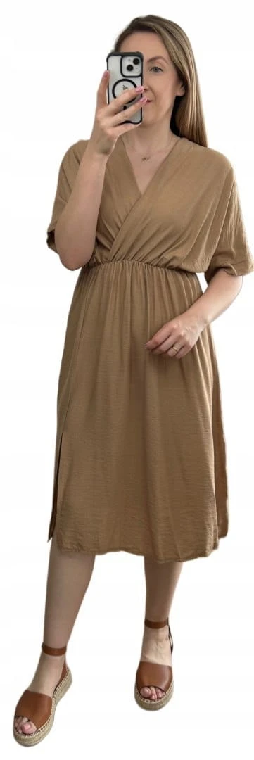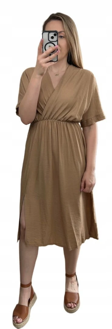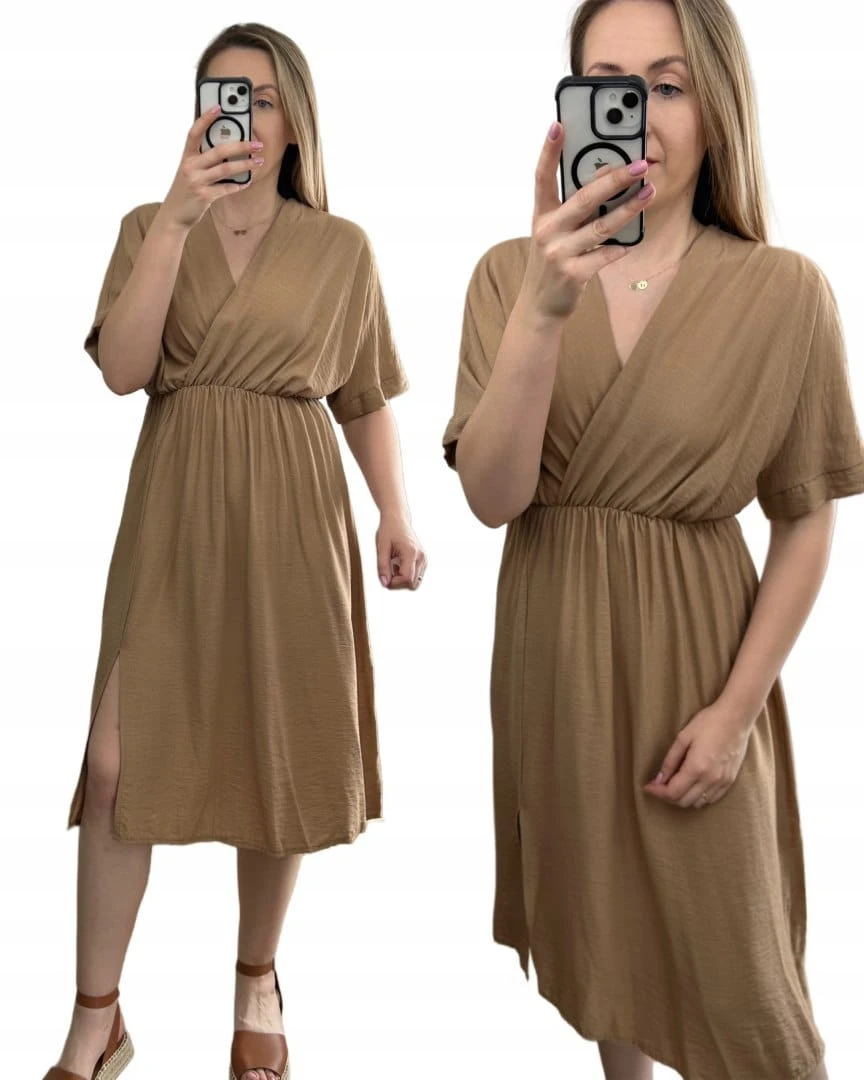 Luźna wiskozowa sukienka midi z rozcięciem kopertowy dekolt wiskoza karmel