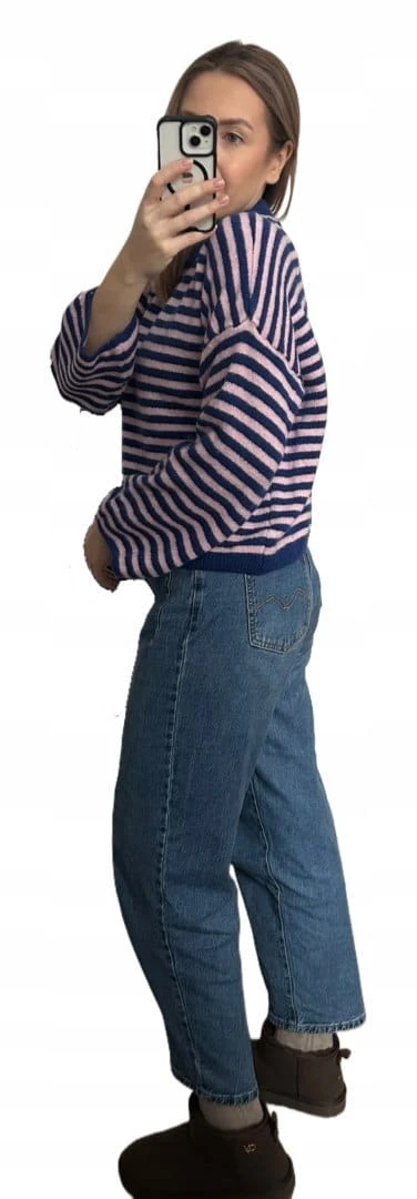 Luźny sweter w poziome paski szeroki rękaw wiskoza wełna róż granat- STRIPY BELLA