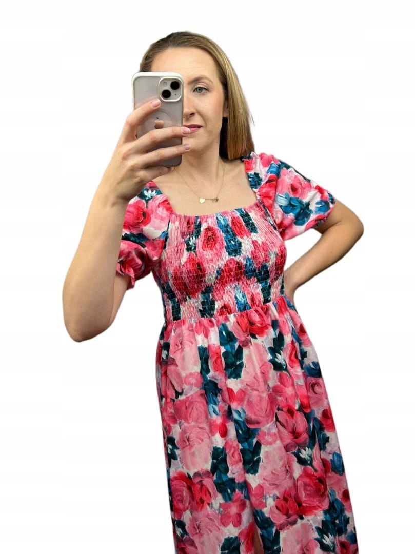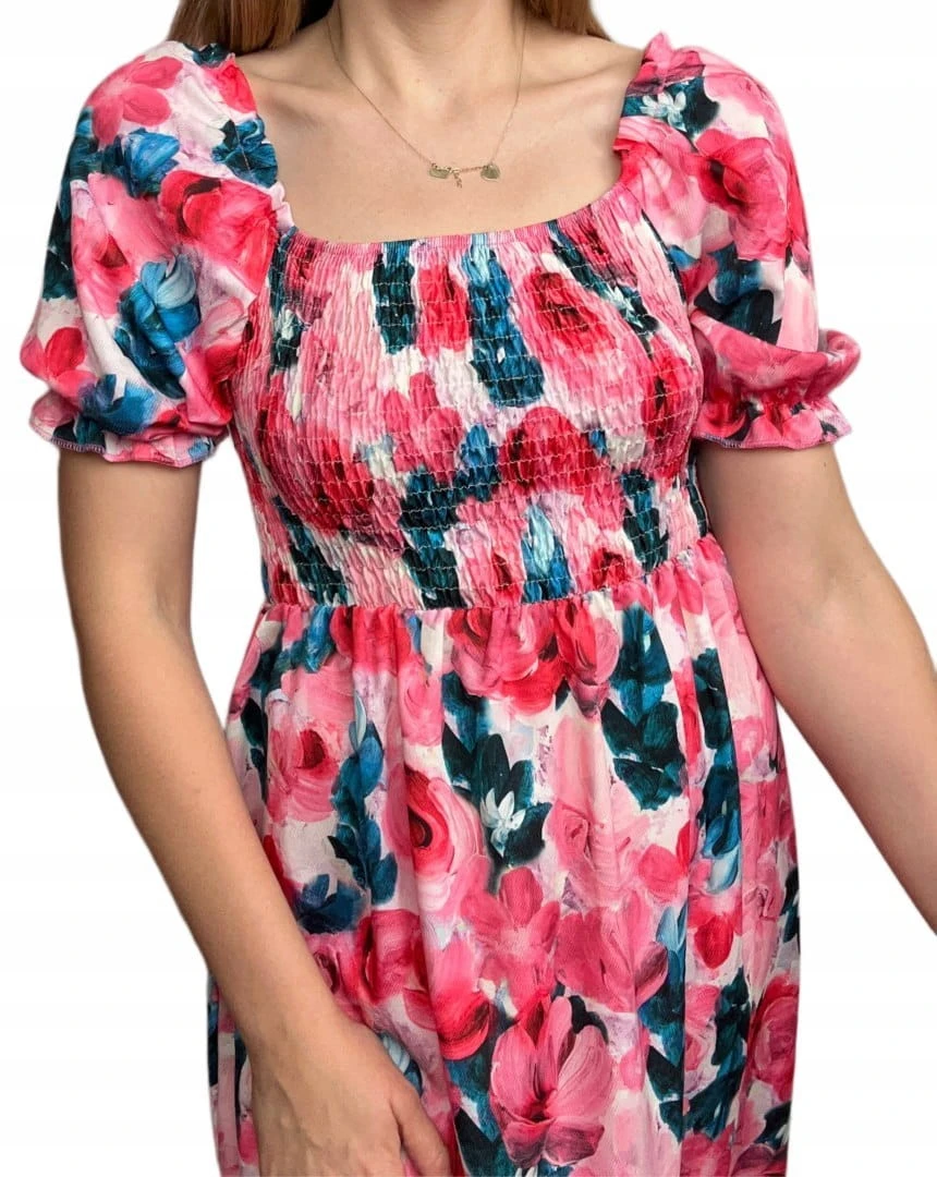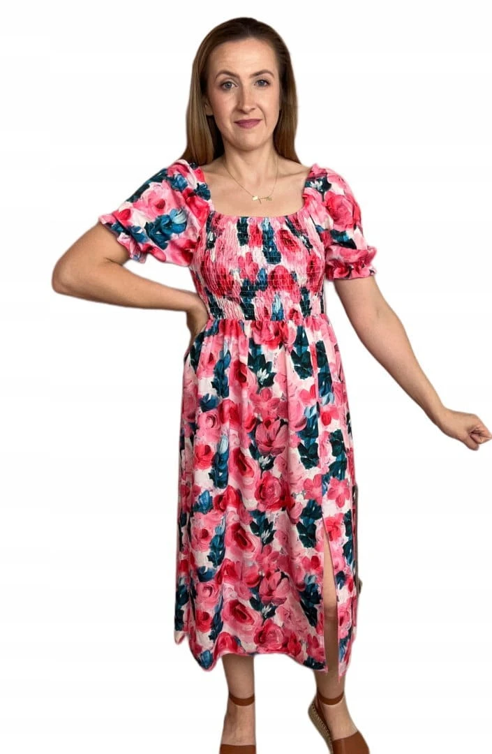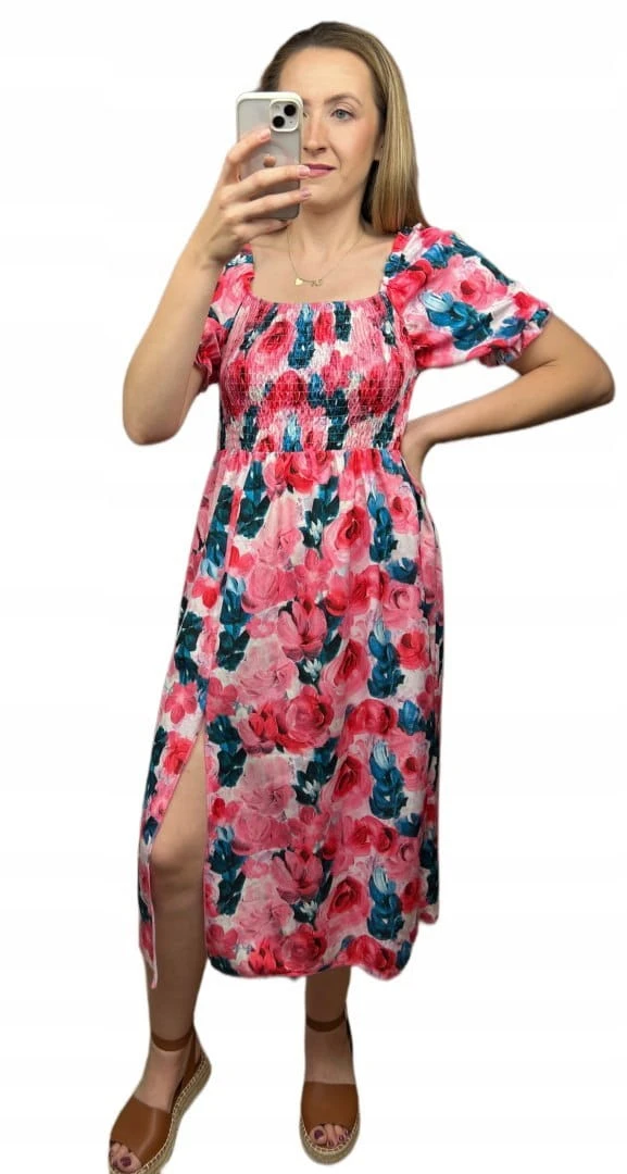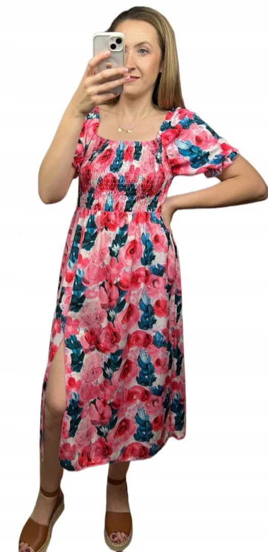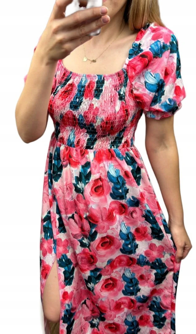 Midi dłuższa sukienka hiszpanka rozcięcie kwiaty kwiatki wiskoza S M L