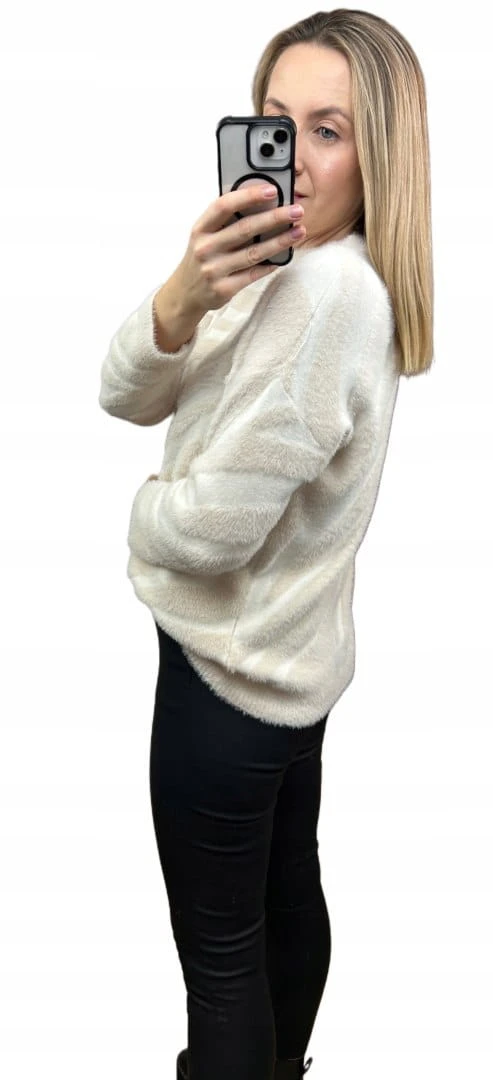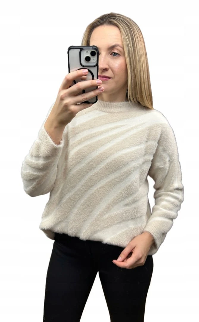 Luźny sweterek z okrągłym dekoltem w zebrę. Niezwykle miły w dotyku i ciepły. Końce rękawów oraz dół swetra zakończone ściągaczami.
