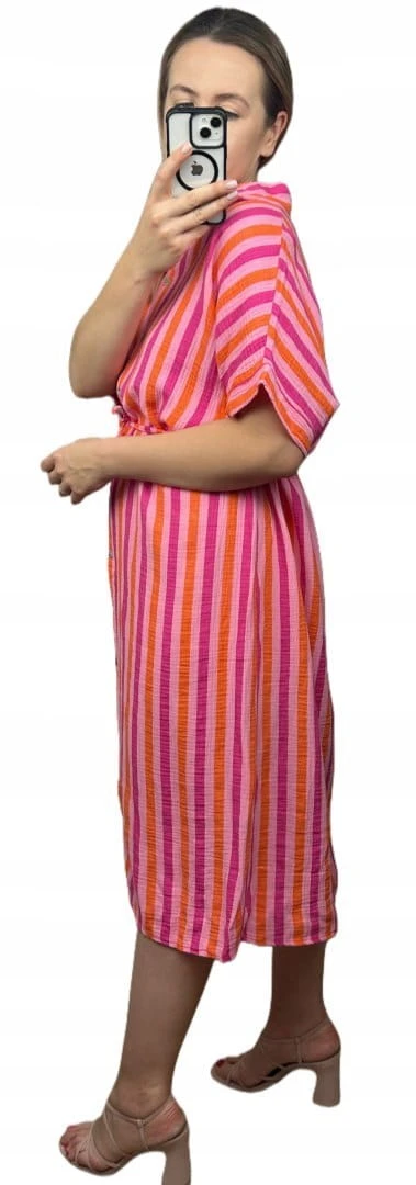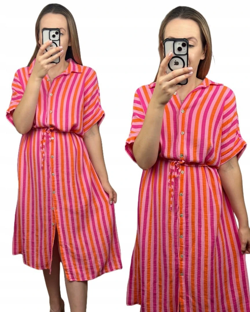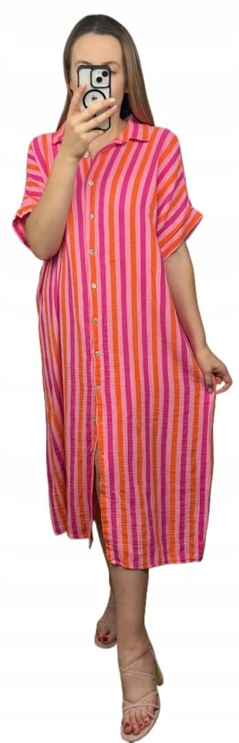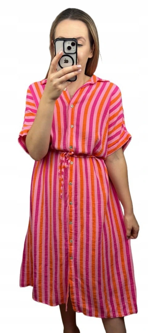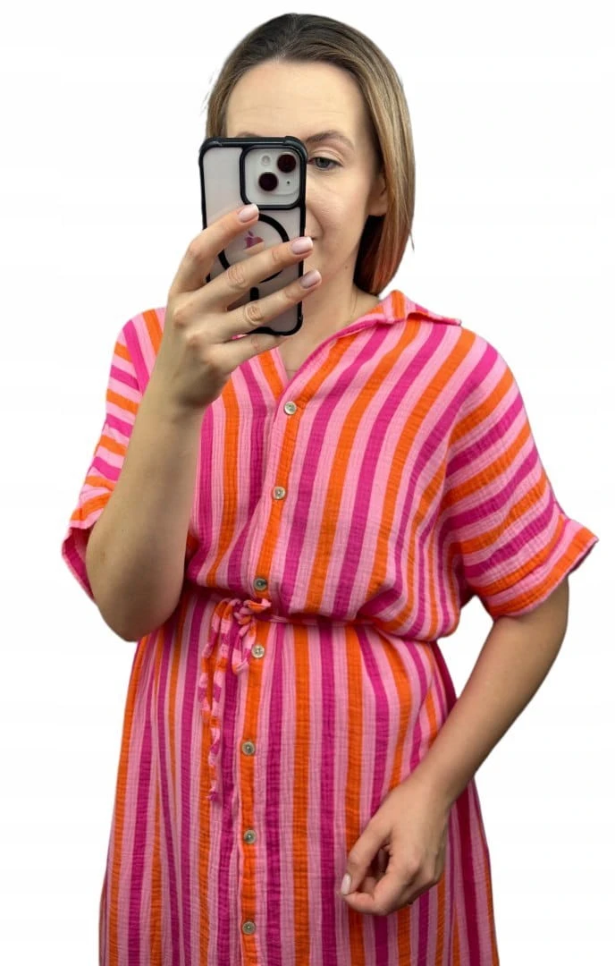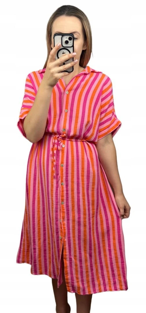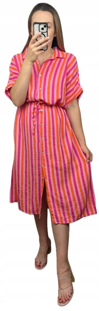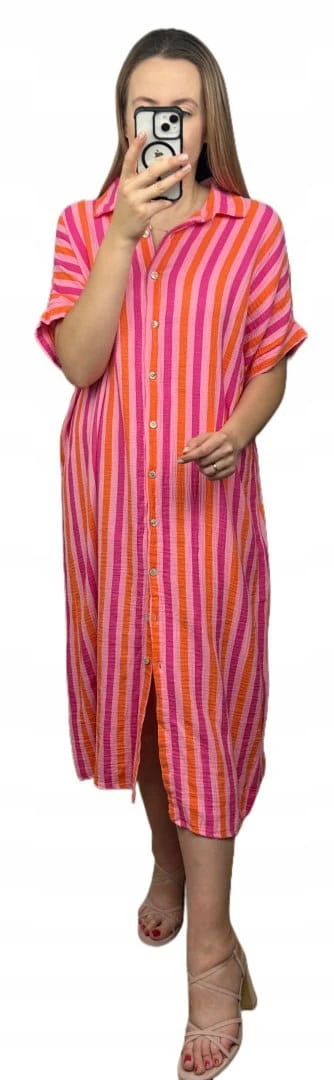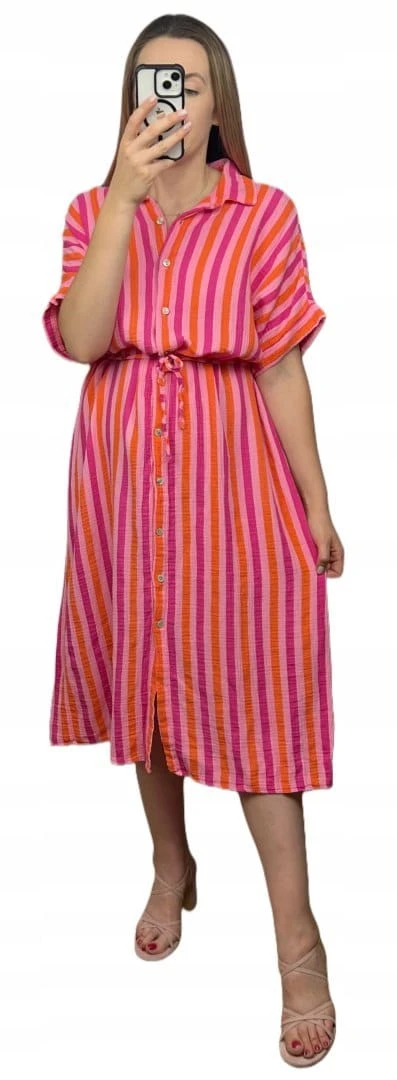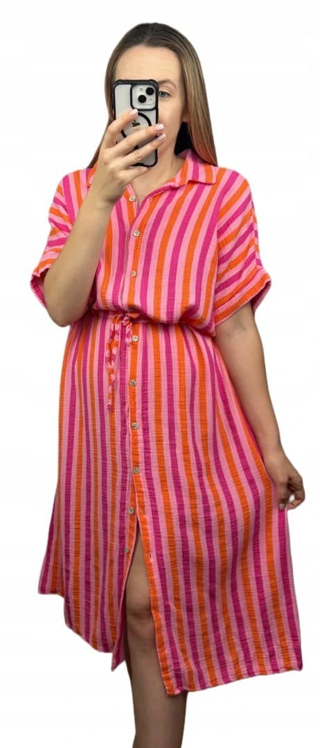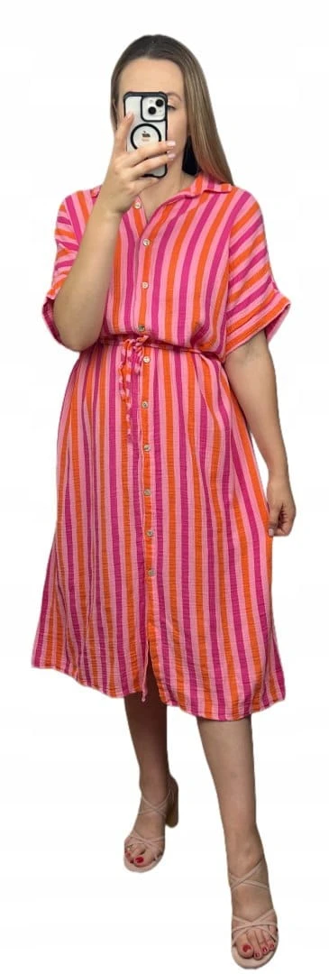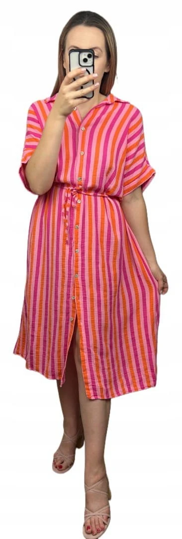 Muślinowa sukienka midi dłuższa szmizjerka koszulowa oversize guziki paski