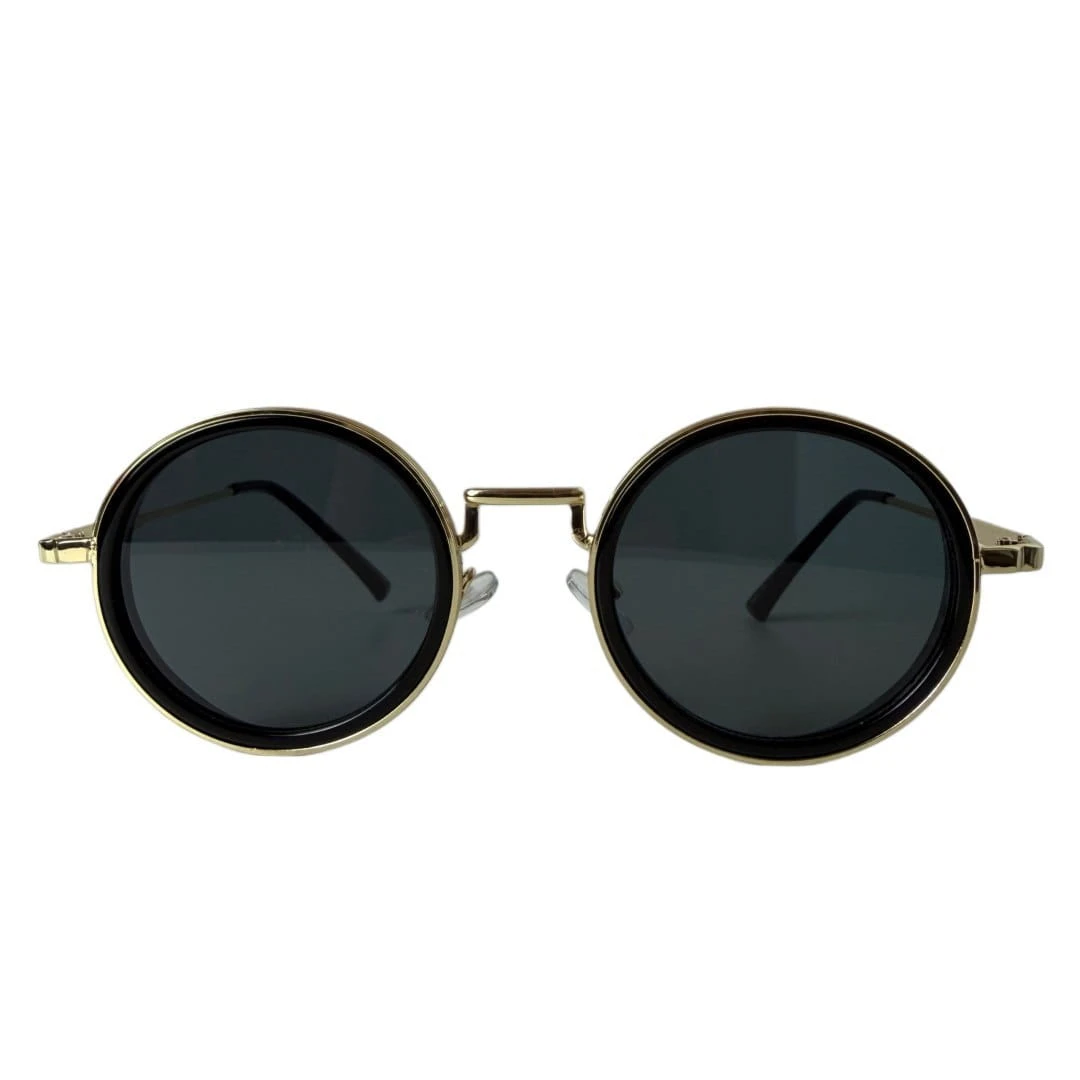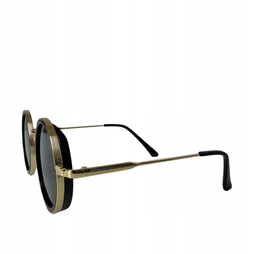 Stylowe okulary przeciwsłoneczne w ponadczasowym, okrągłym kształcie inspirowanym modą retro.Połączenie czarnych soczewek z elegancką złotą oprawą nadaje im minimalistyczny i bardzo modny charakter.