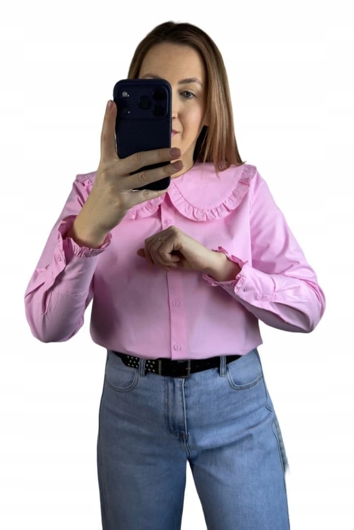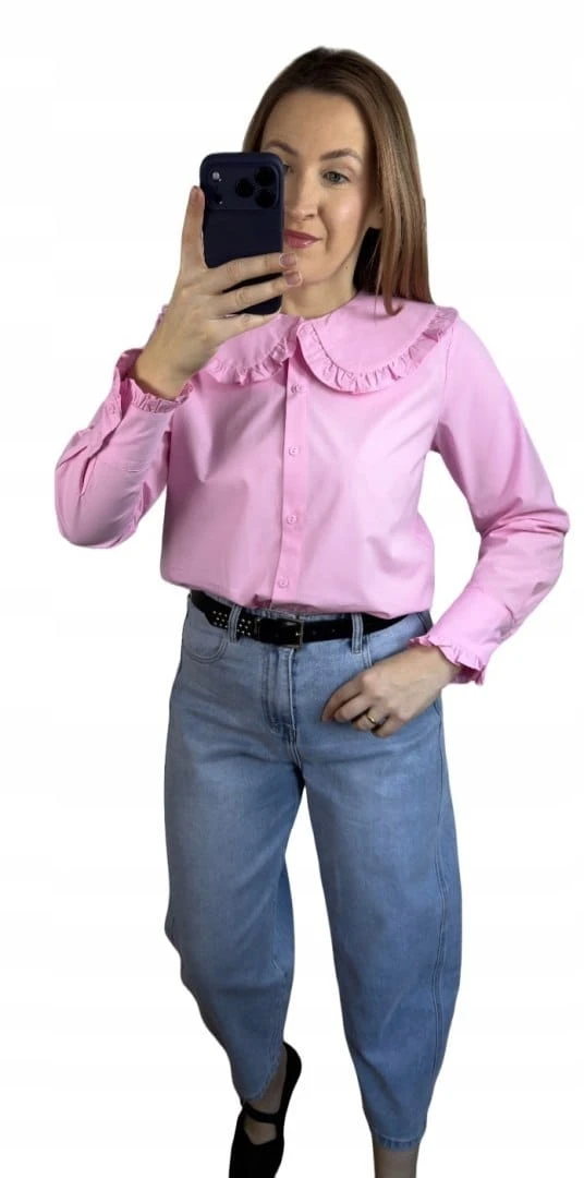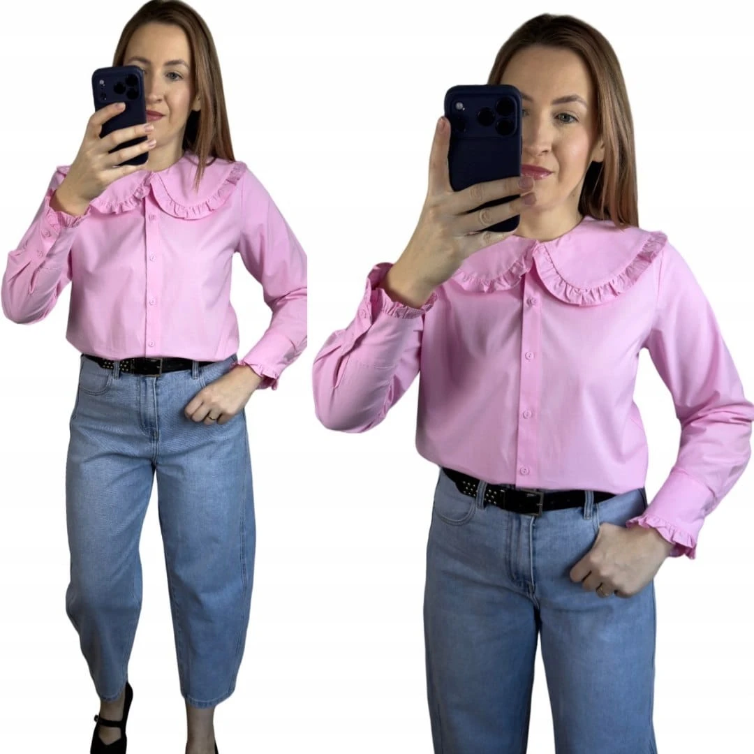 Różowa koszula bawełniana z kołnierzem falbanką L