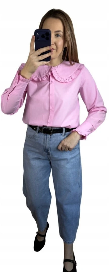 Różowa koszula bawełniana z kołnierzem falbanką S
