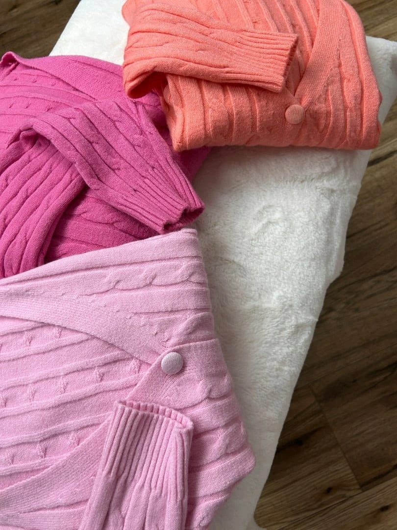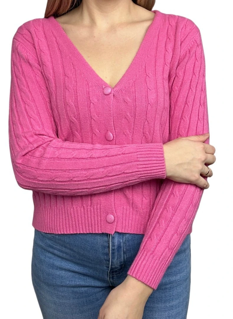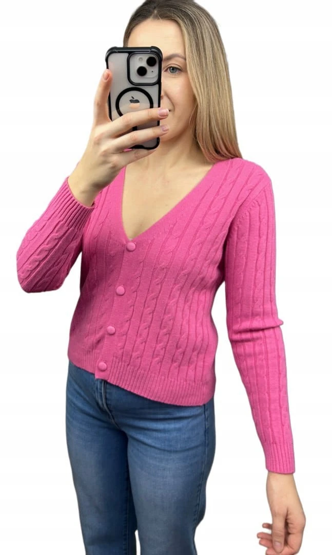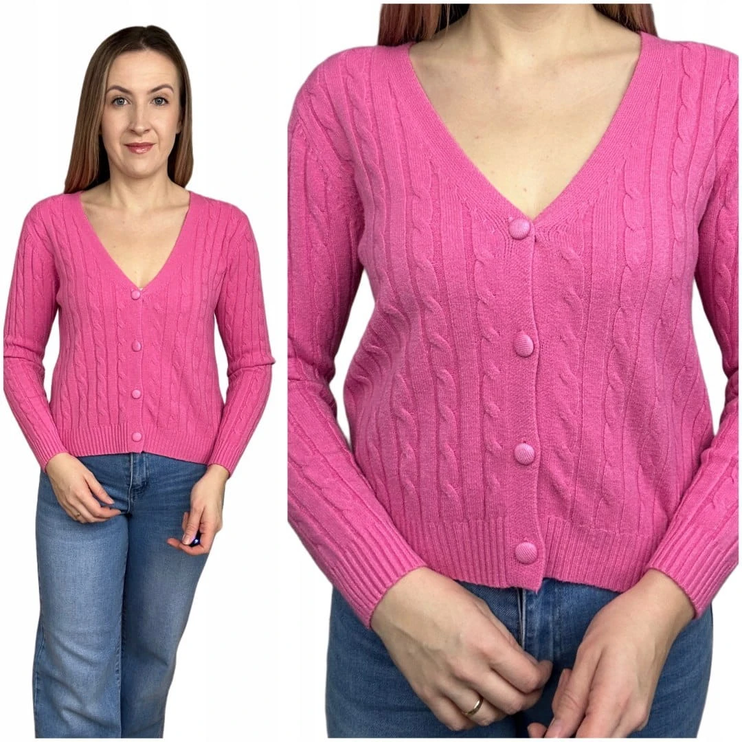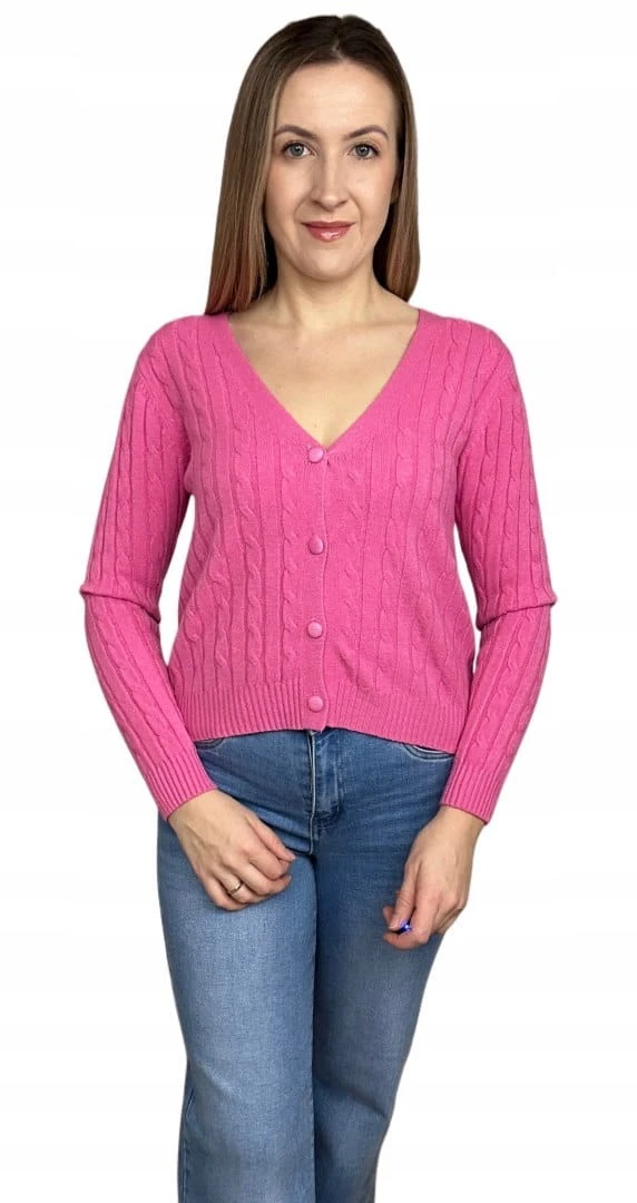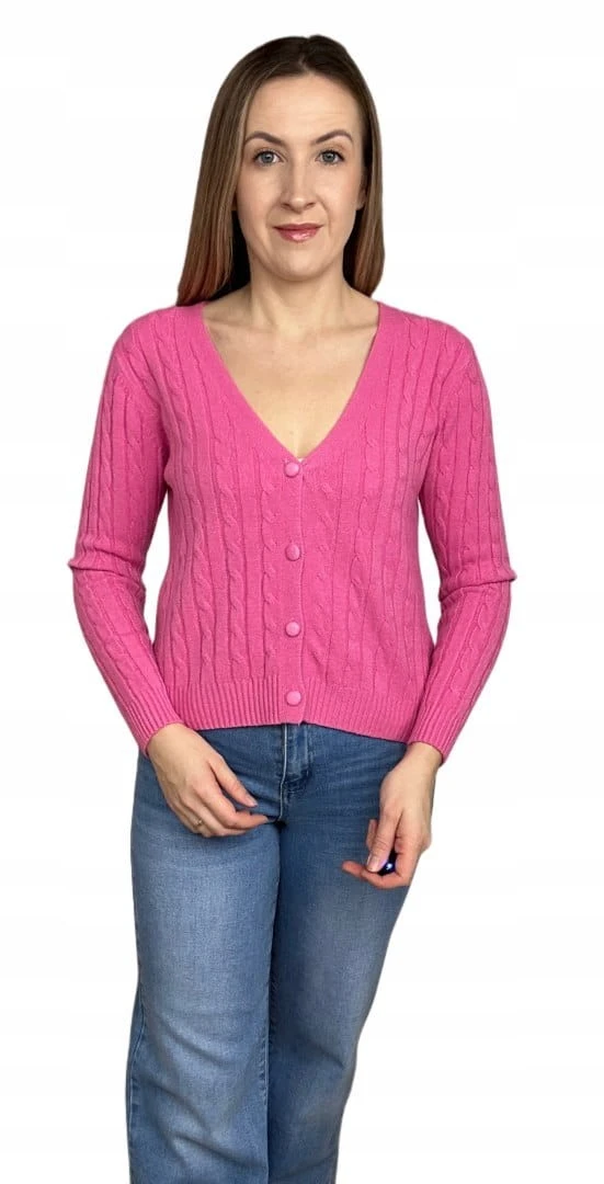 Różowy sweterek guziki warkocz wiskoza dekolt V dopasowany Dolce Piccante
