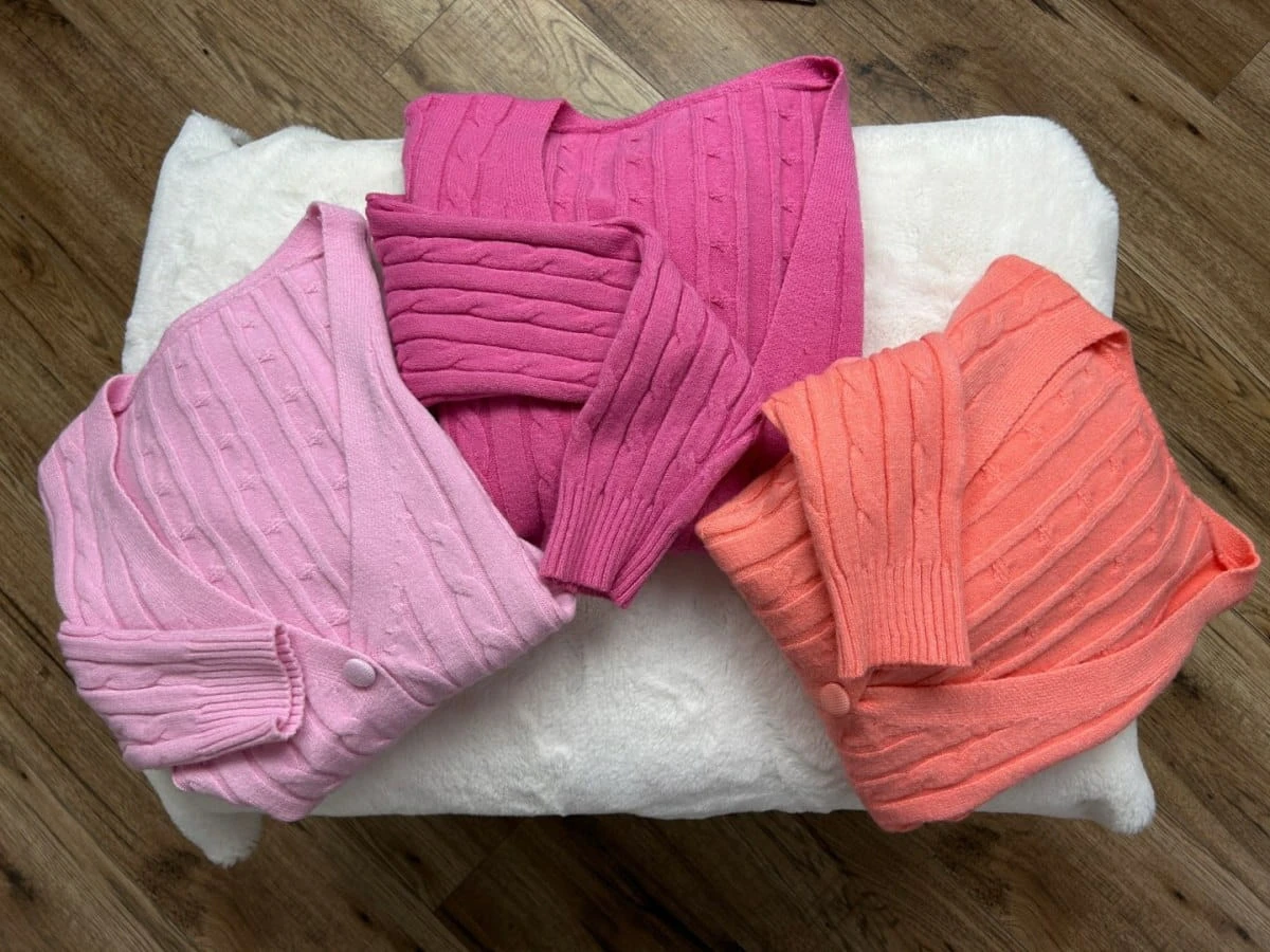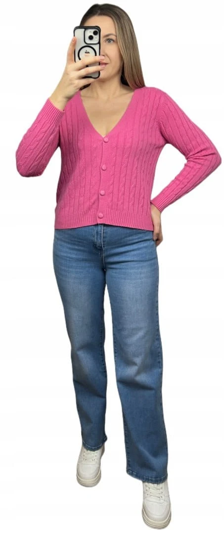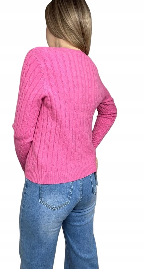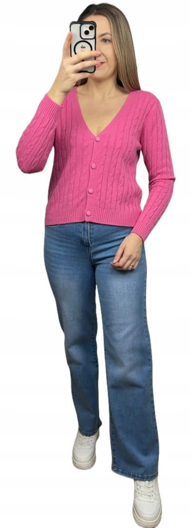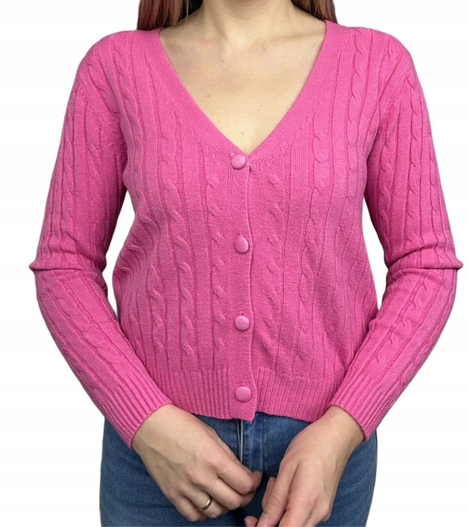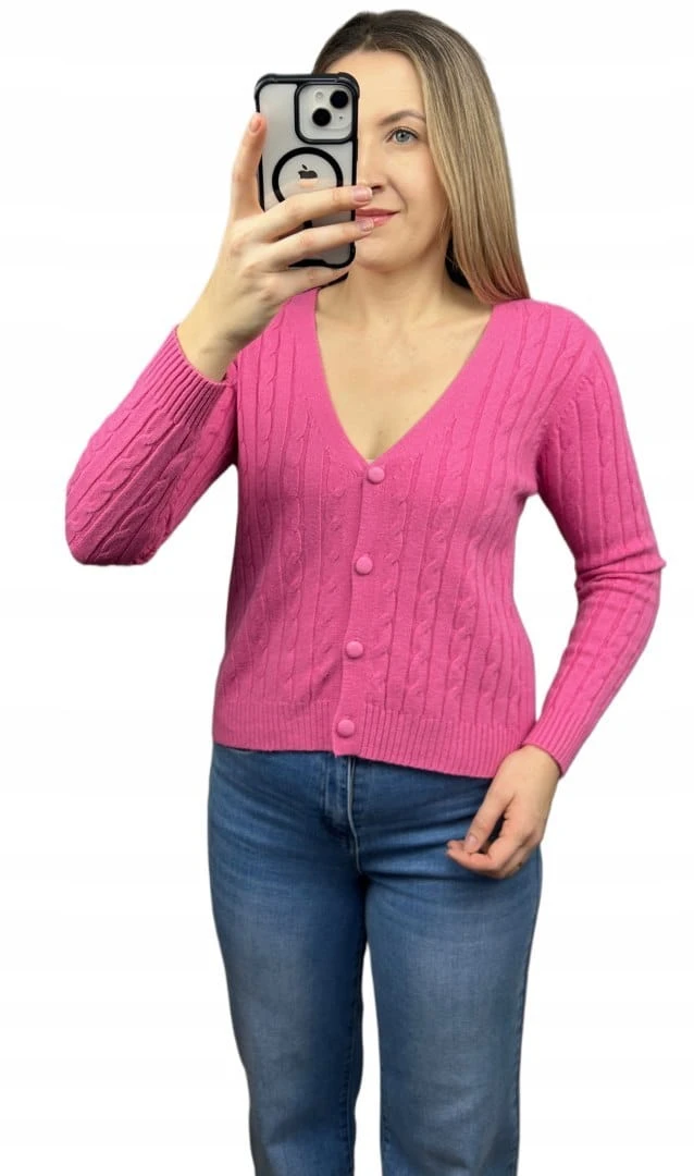Różowy sweterek guziki warkocz wiskoza dekolt V dopasowany Dolce Piccante