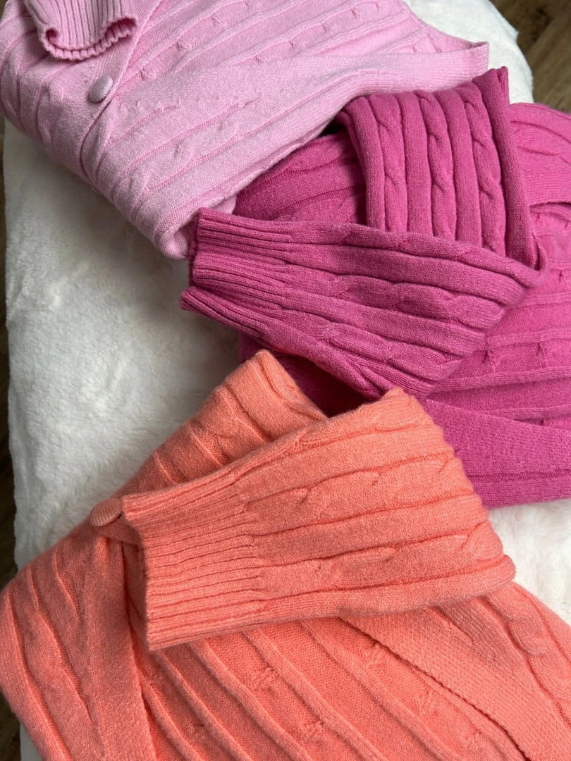 Różowy sweterek guziki warkocz wiskoza dekolt V dopasowany Dolce Piccante