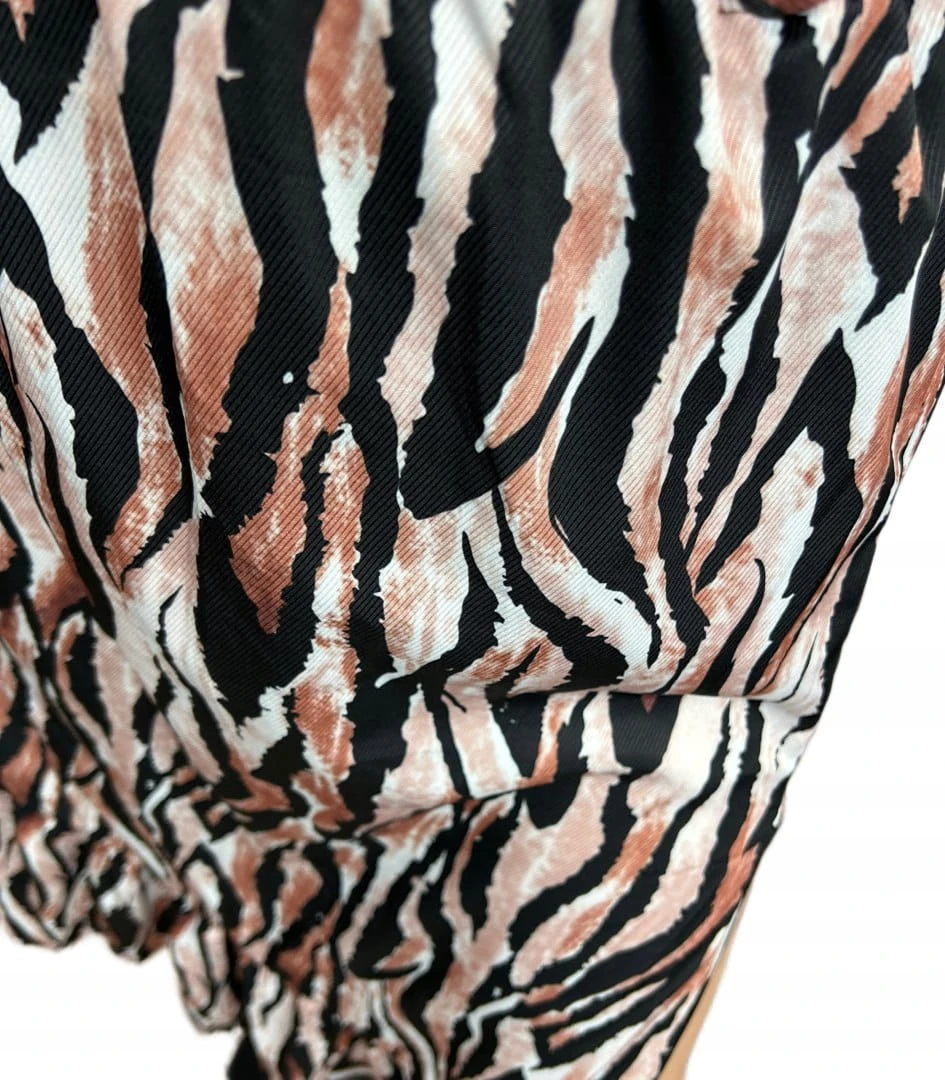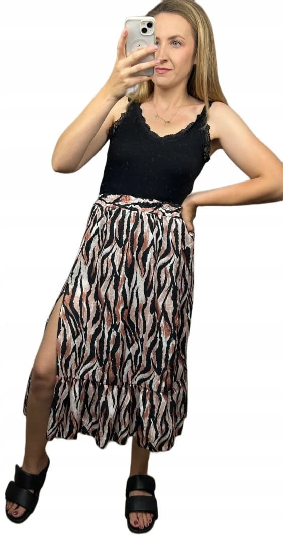 Spódnica z rozcięciem to idealny model zwiewnej spódnicy w zwierzęce wzory. Idealnie sprawdzi się w letnich oraz jesiennych stylizacjach. Można stylizować zarówno do eleganckich butów jak i trampek.