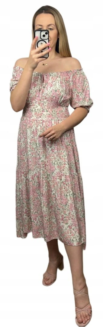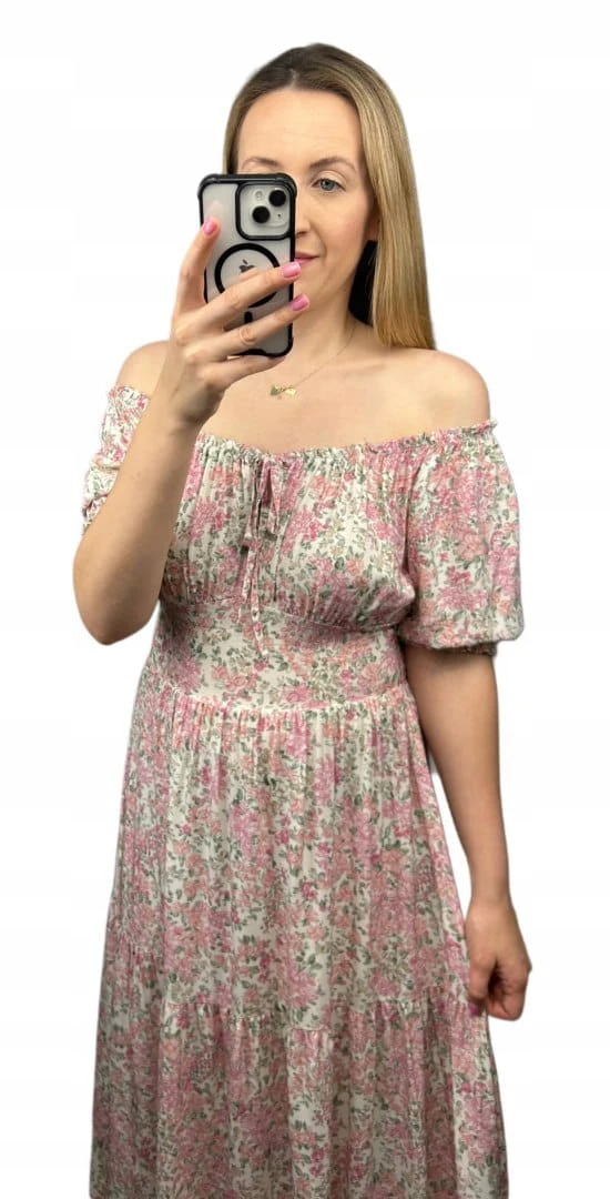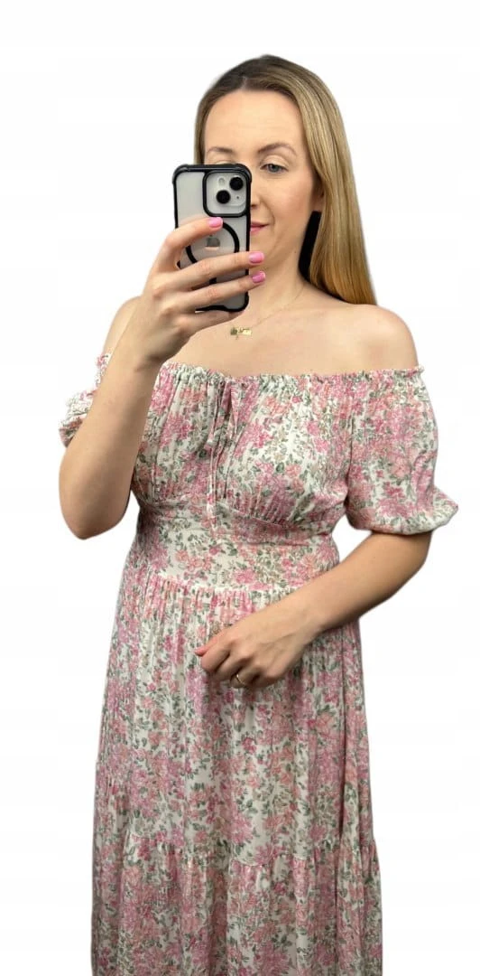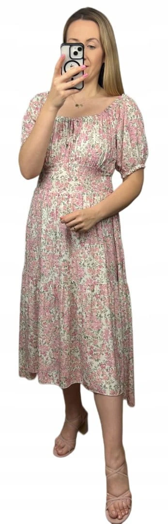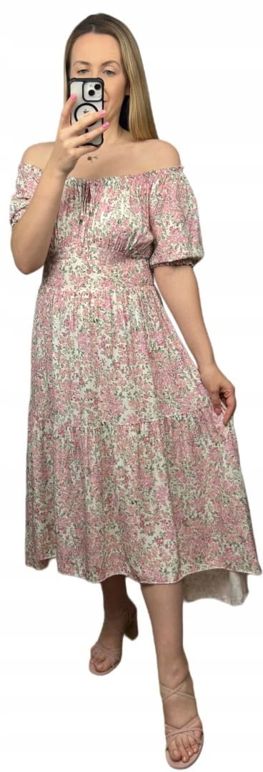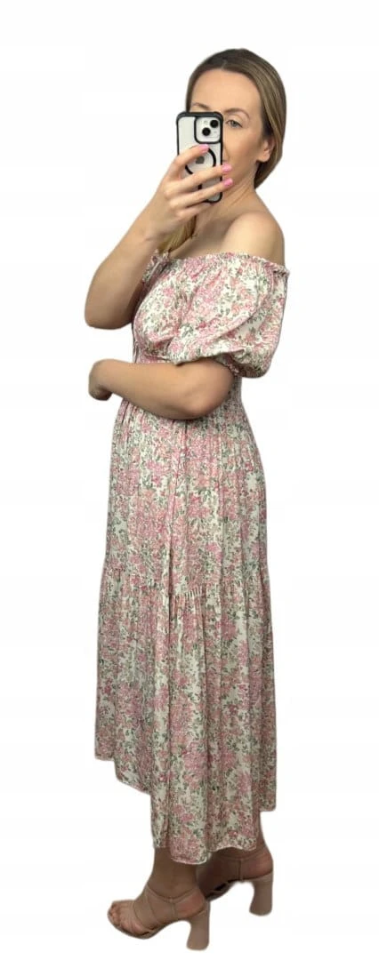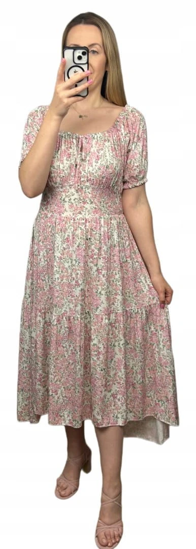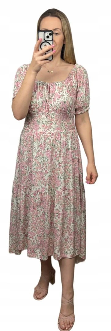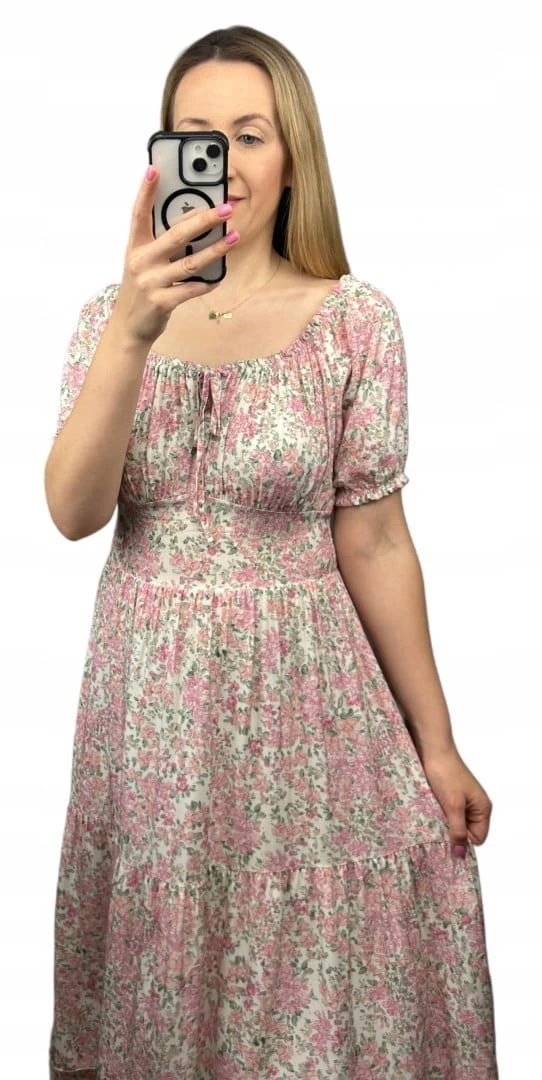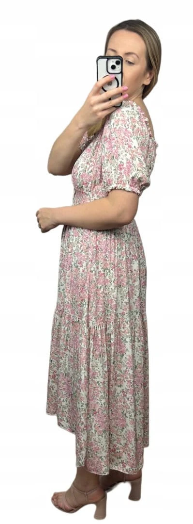 Sukienka hiszpanka w kwiaty asymetryczna midi dłuższa różowa jasny beż